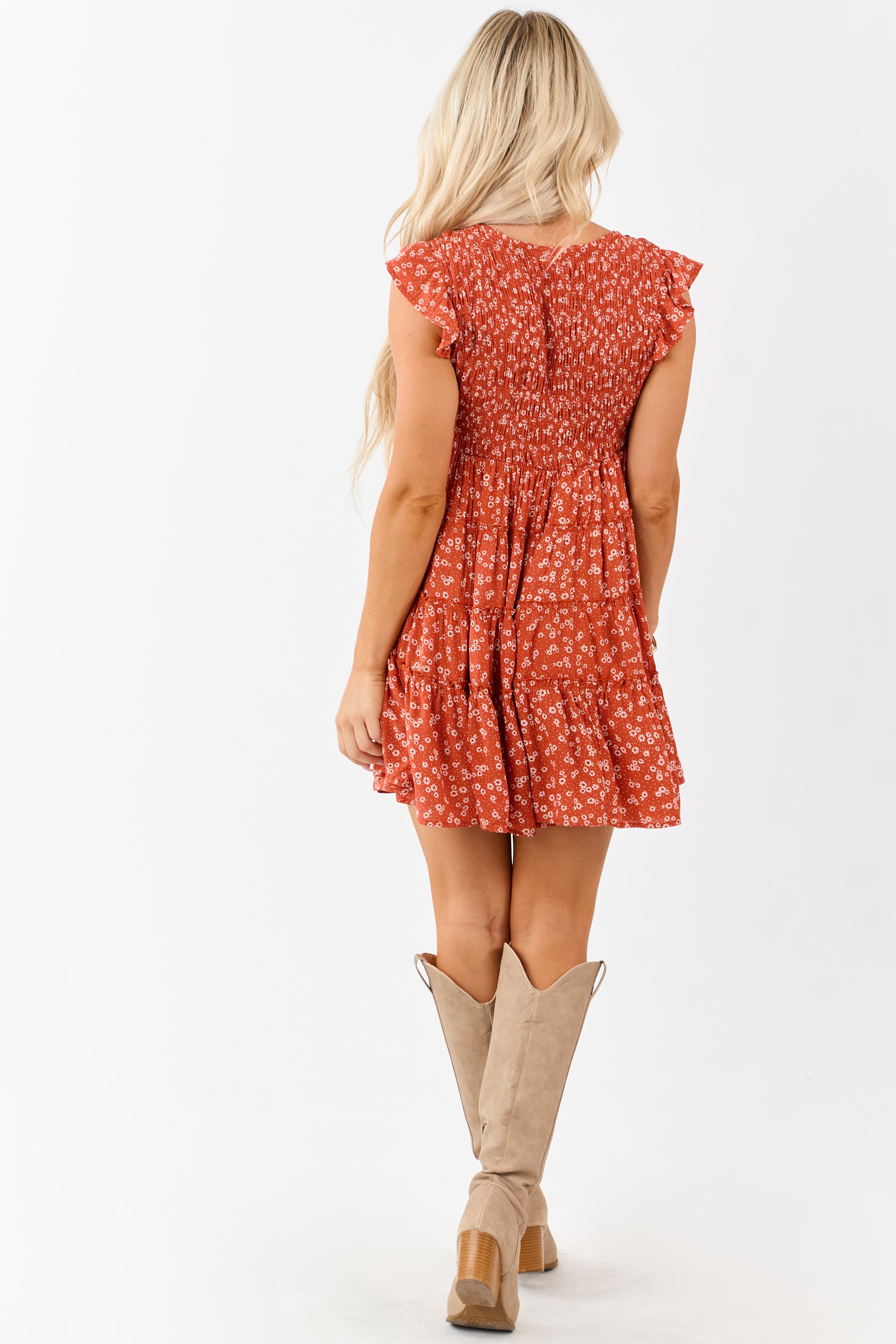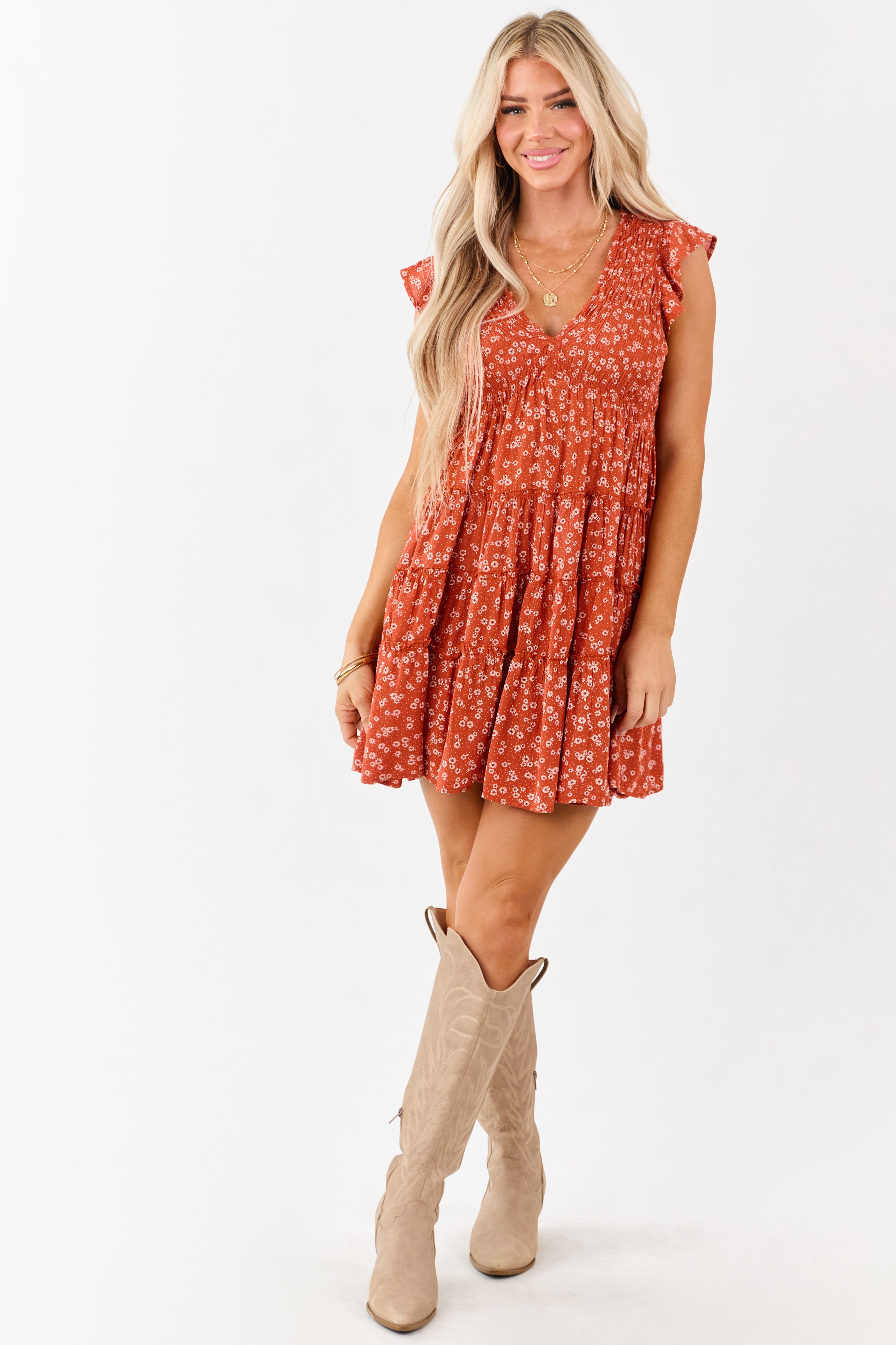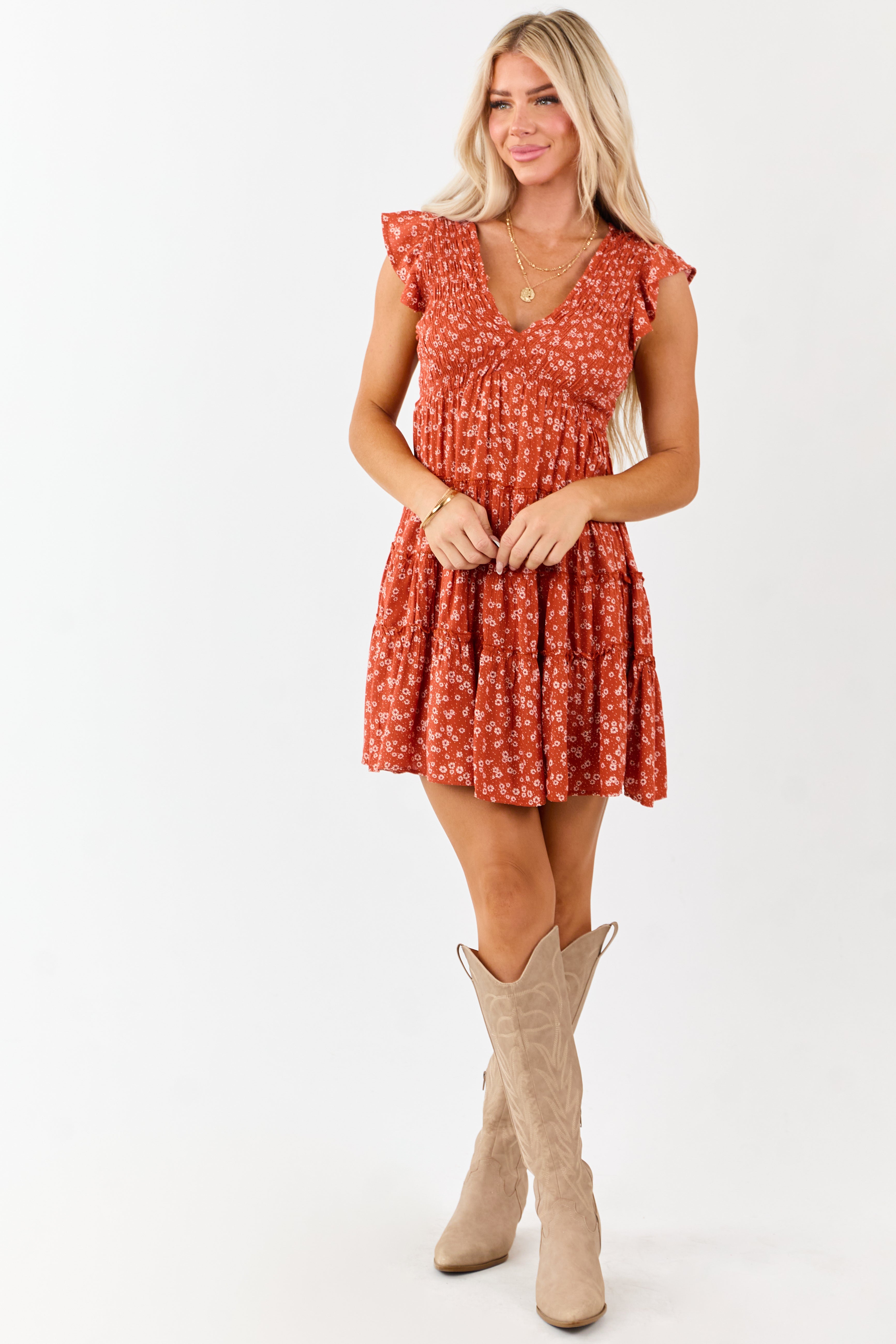 This stunning Orange Cap Sleeve Mini Dress features a smocked bodice, frill tiered skirt, and ditsy florals design. Ideal for any occasion, this day-to-night dress offers comfort and style in sizes XS to XL. Crafted from 100% Rayon, with a stretchy bodice and a touch of elegance with a ruffle trim. Unlined and featuring a Sweetheart neckline for a flattering fit. Your go-to option for effortless chic.