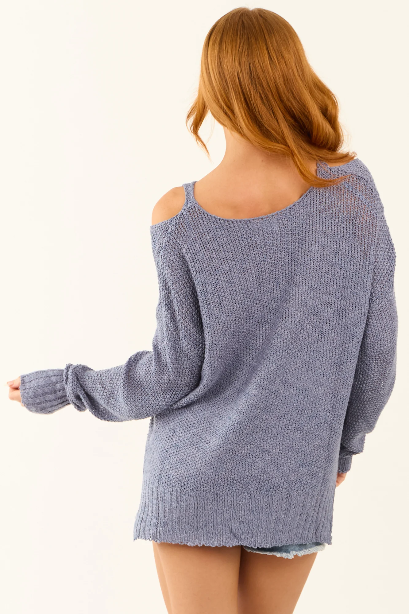 Stay stylish and cozy with our Dusty Blue Knit Cold Shoulder Sweater. This semi-stretchy sweater features long sleeves, a drop shoulder, V neckline, and ribbed banded trim for a trendy look. The side hem slits add a touch of sophistication. Made of 90% Acrylic and 10% Polyester, its perfect for any occasion. Remember to hand wash with cold water, avoid bleach, and line dry. Available in sizes S/M and M/L. Ideal for those who appreciate comfort without compromising style.