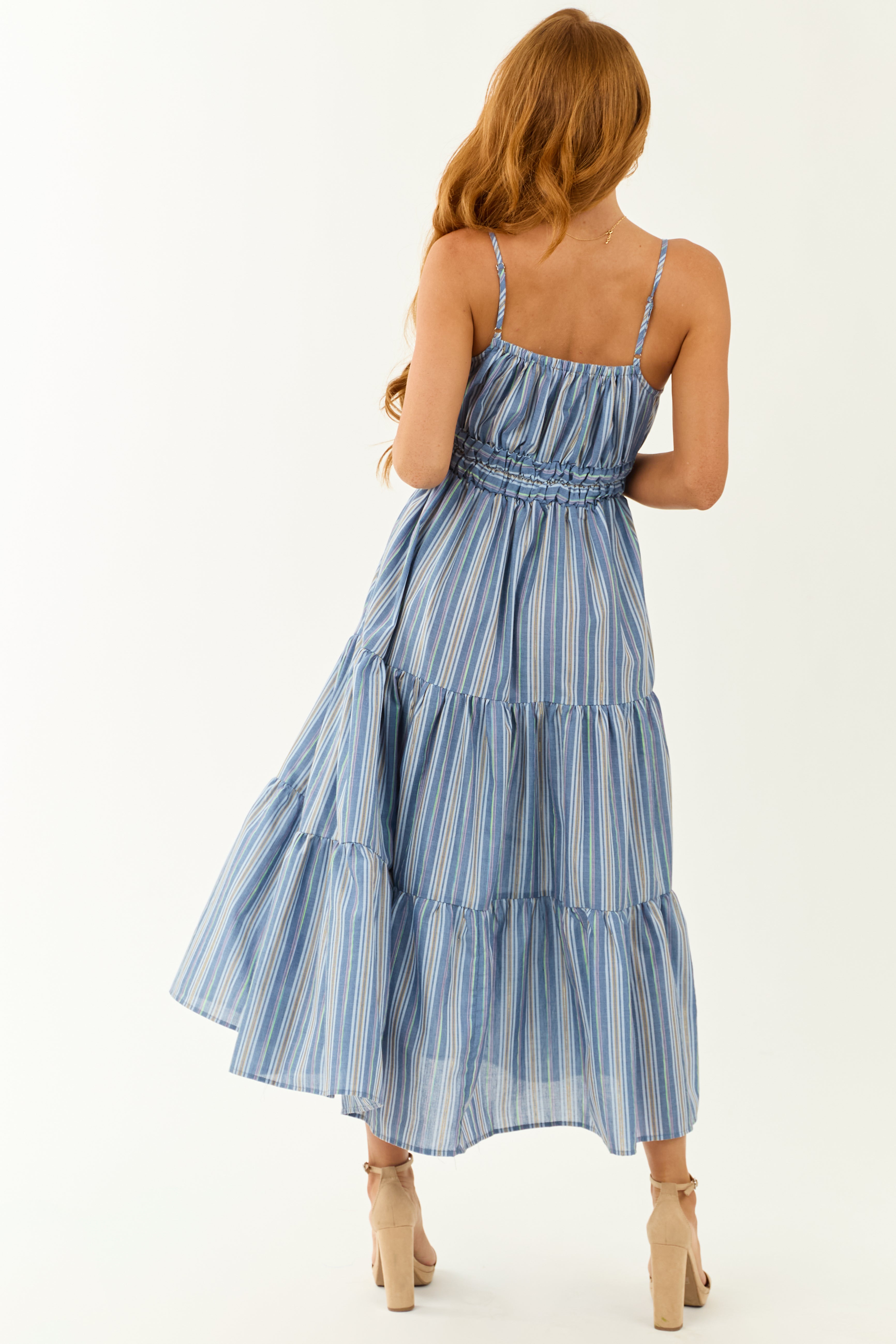 This flowy Dusty Blue Striped Midi Dress is comfortable and flattering, perfect for various occasions. Made of non-stretchy cotton with metallic stitching details. Featuring an elastic ruched waistband, adjustable spaghetti straps, and a bust tie for a custom fit. The Square neckline with notch and sleeveless design add to its charm. Size Small: Bust 34″, Waist 25″. Available in sizes S, M, L.
