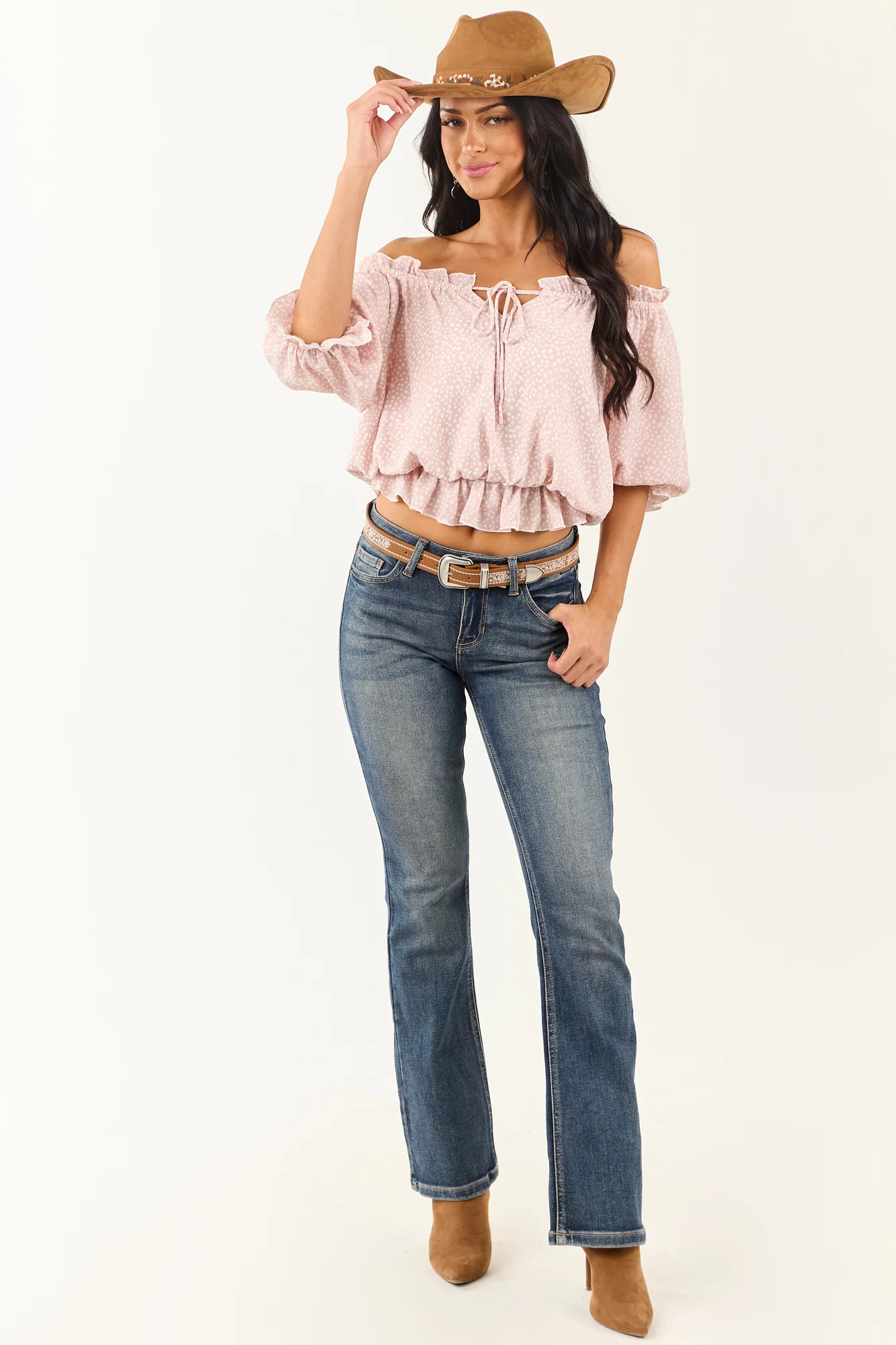 This flowy off-shoulder crop top in Dusty Blush exudes a sweet cottagecore vibe. Featuring a relaxed fit, ruffle trim, and elegant pebble print in shades of Ivory, this top offers an oversized silhouette with elastic neckline, hem, and cuffs. With a versatile notch neckline, tie detail, and 3/4 bubble sleeves, the top is made of 100% Polyester with a lined bodice. Ideal for a charming and chic look. Available in sizes S, M, and L.