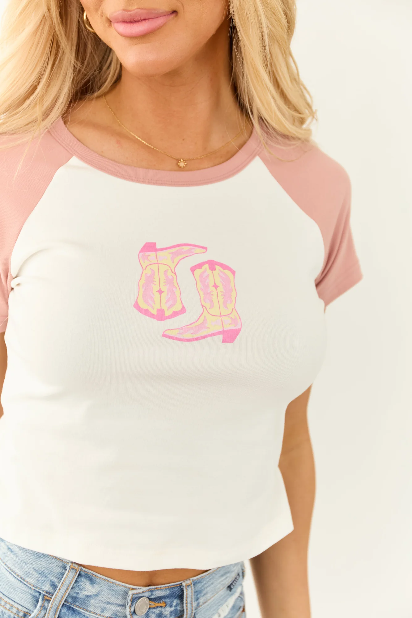Enhance your style with this adorable embroidered cowboy boot raglan tee in Dusty Blush. Crafted from semi-stretchy knit fabric, featuring a ringer neckline and short sleeves. Graphics in Bubblegum and Buttercream hues add a playful touch. Care instructions: Handwash cold, color separate, do not bleach, lay flat to dry, iron if needed. Model is wearing size Small.
