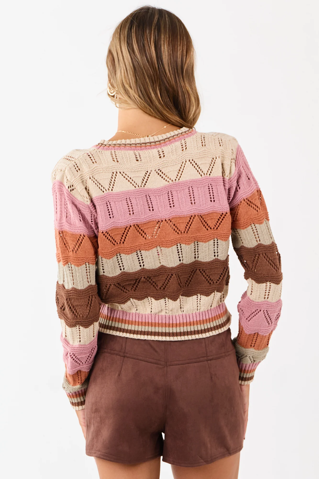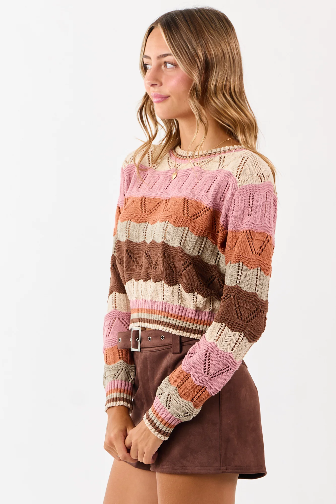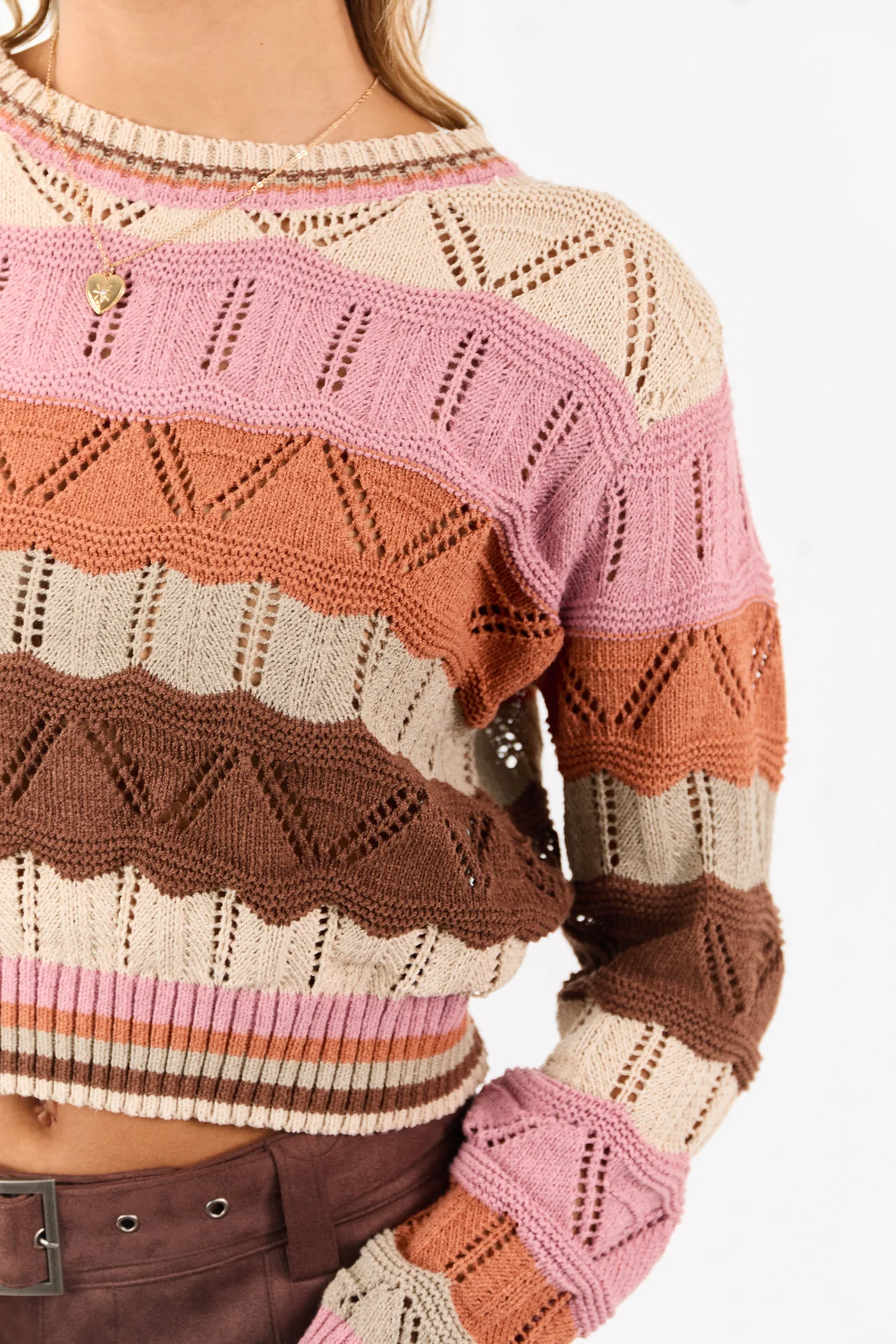 Stay cozy and stylish in this colorful pointelle sweater showcasing soft wavy stripes in shades of Dusty Bubblegum, Terracotta, Ash, and Cocoa. Made from stretchy pointelle knit, it features a semi-cropped length with banded trim. Perfect for a retro-inspired look that stands out. Available in sizes S, M, L, XL. 100% Polyester. Imported.