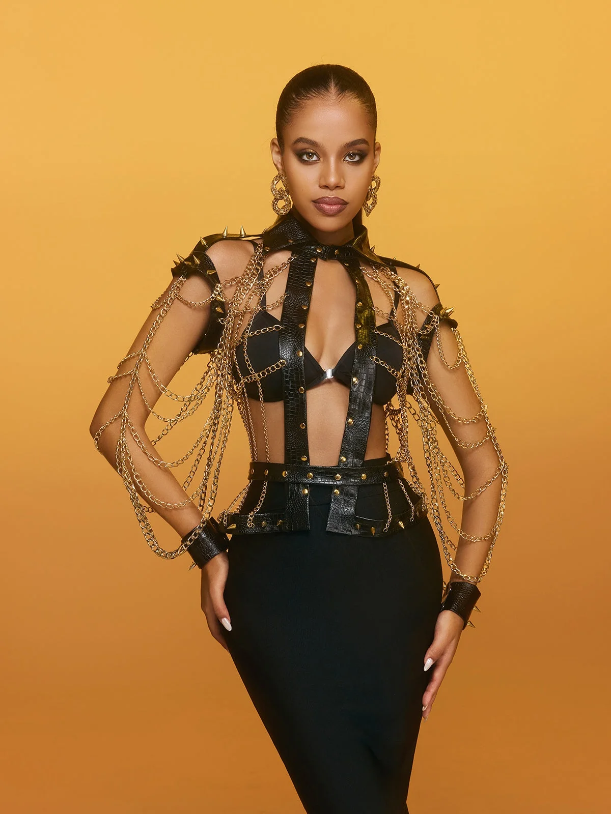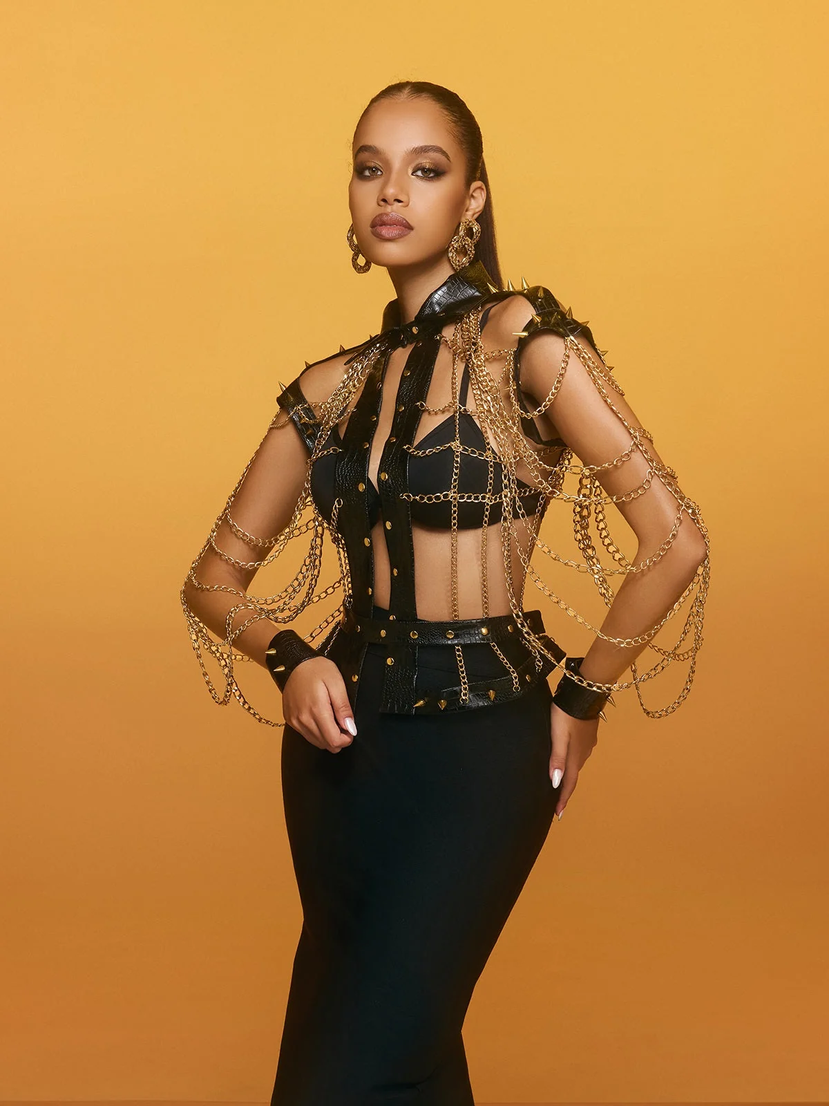 Make a fierce statement with the Edgy Spike Leather Chain Top. This uniquely designed top features bold spikes and a striking chain design for a modern, rebellious look. Perfect for standing out at concerts, nights out, or fashion-forward events. Crafted from 100% polyester with a slight stretch for comfort. Dry clean only. Express your confident attitude with this attention-commanding piece. Embrace its edgy style that complements various outfits and occasions effortlessly. Note: Color may vary under different lighting conditions. Model showcased wearing size S.