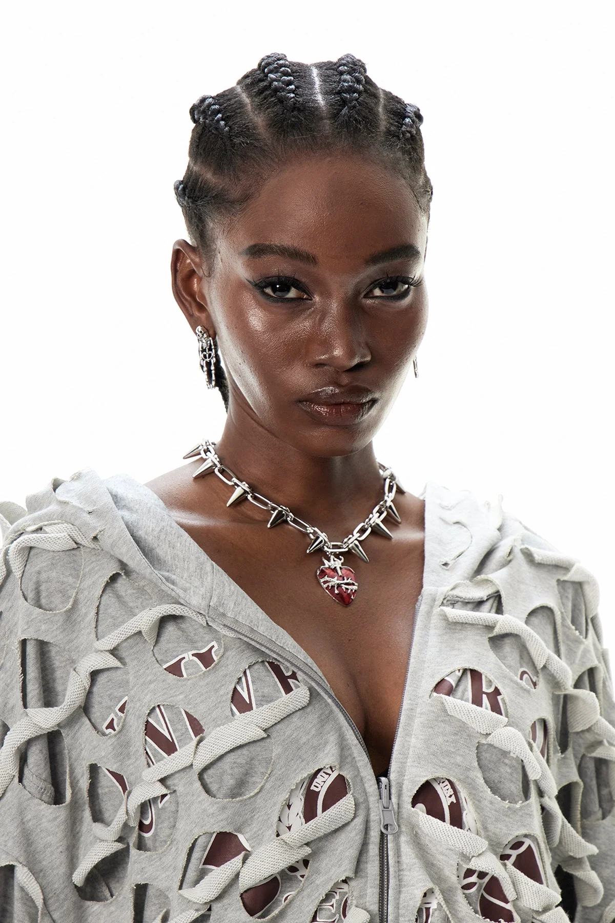 The Edgy Studded Heart Choker in Silver offers a bold statement piece with a rebellious yet refined touch. Crafted with meticulous detail, this adjustable choker features a striking heart centerpiece adorned with metal studs. Incorporating comfort and style, this punk-inspired accessory is perfect for those who seek a sophisticated and confident look.