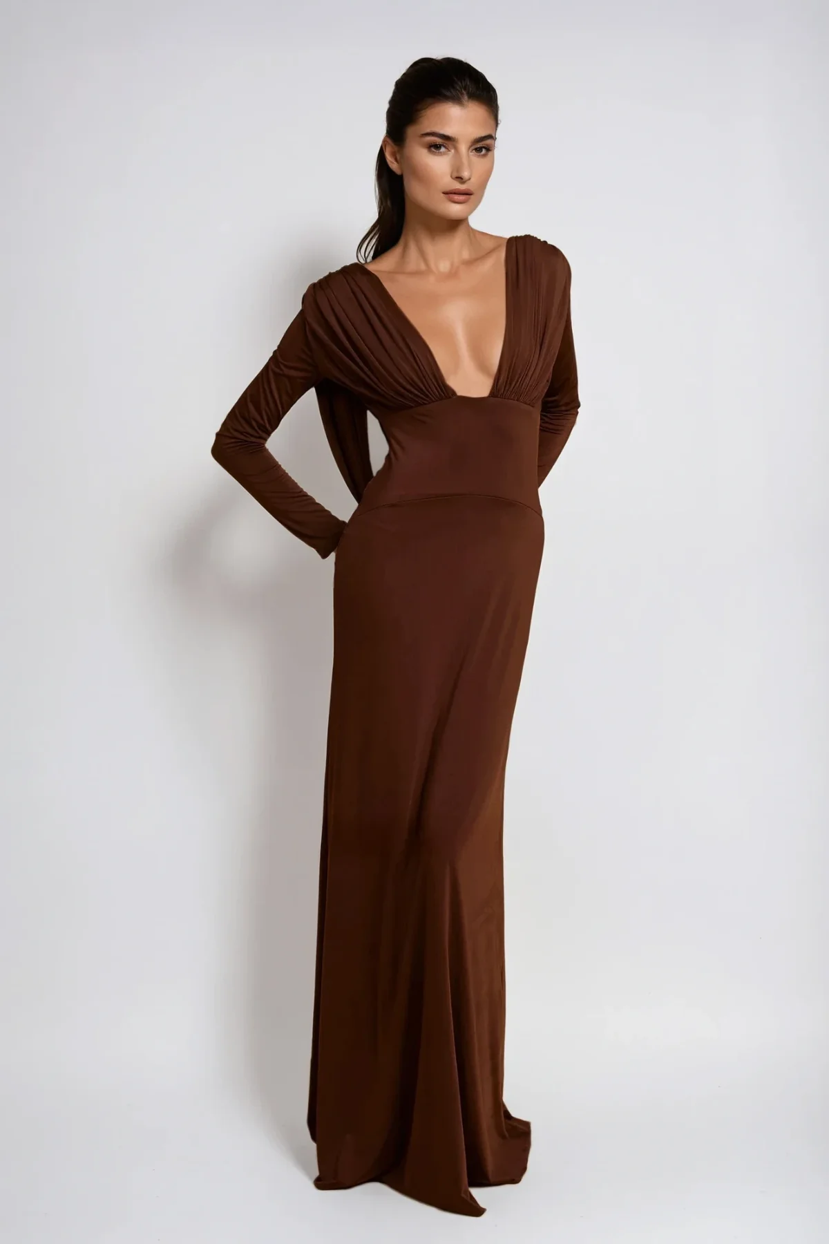Indulge in the sophistication of the Elegant Backless Ruched Maxi Dress. Designed with a stunning backless look, flattering ruched details, and an alluring plunging neckline. This dress is perfect for special occasions, offering a slight stretch for comfort. Make a statement with this must-have fashion-forward piece that adds allure to any wardrobe. Gentle machine wash recommended. Please note, color may vary due to lighting. The product images accurately represent the true color.