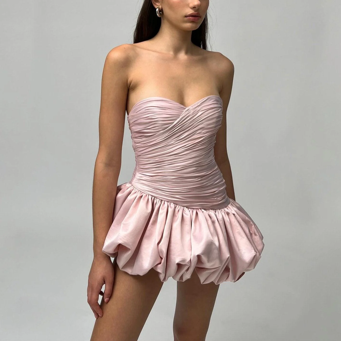 Elevate your style with the Elegant Balloon Draped Mini Dress in Pink and Ivory . This stunning mini dress features cascading draped ruching for a sculpted silhouette. Its voluminous design exudes bold elegance, while the invisible side zipper ensures a seamless finish. Perfect for special occasions where you want to make a statement, this dress pairs beautifully with vintage slingbacks and minimalistic jewelry. Crafted from high-quality fabric for durability and comfort, this dress is a must-have for your wardrobe.