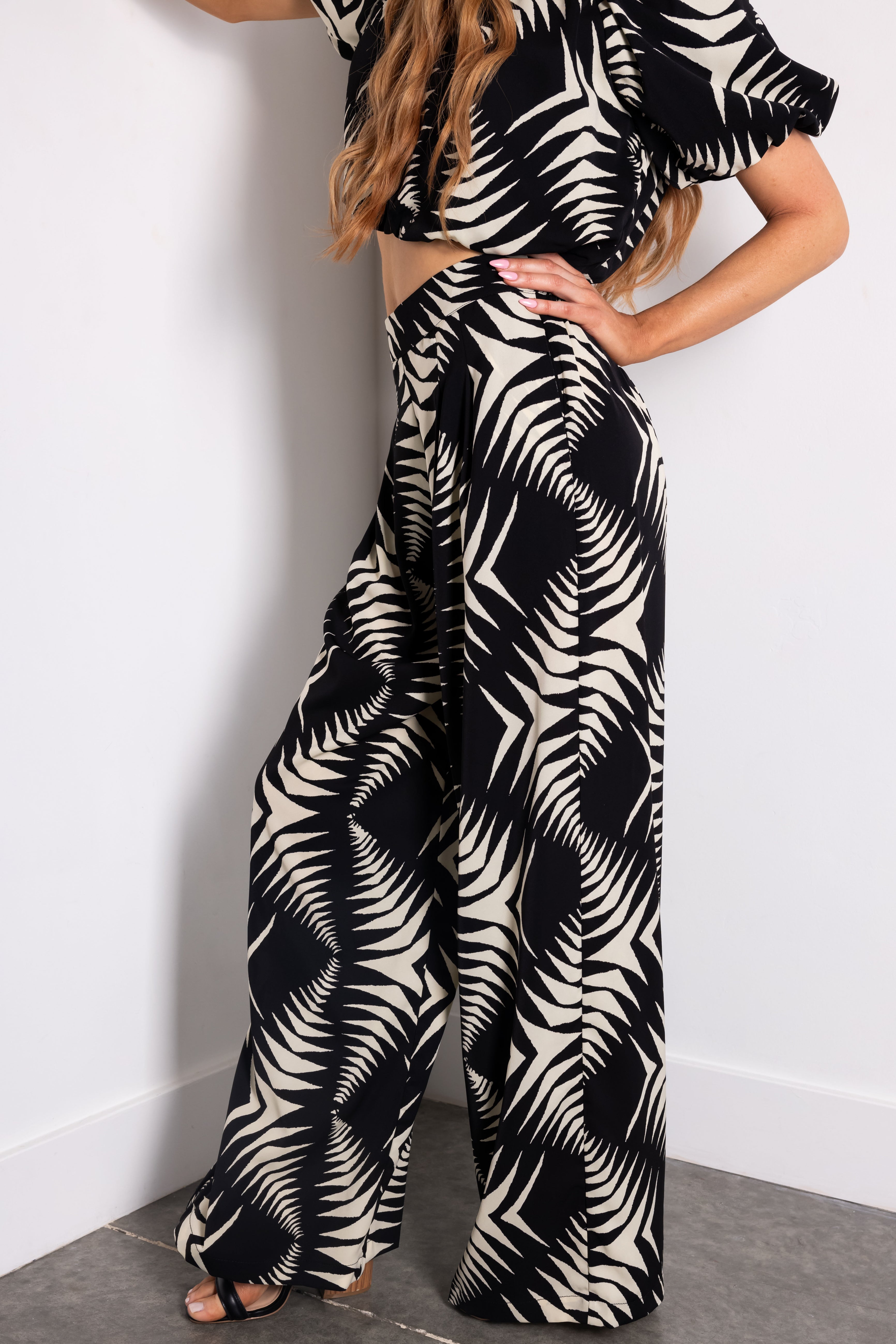 Indulge in sophistication with our elegant black and cream wide leg pants . Available in sizes Small, Medium, and Large, with waist measurements ranging from 26 to 36 inches and inseam options from 30 to 31 inches. These non-stretchy woven bottoms feature an elastic back waistband, practical pockets, and exquisite pleating details throughout. Unlined and imported, crafted from 100% Polyester material ensuring a luxurious feel. Pair them effortlessly with our Black and Cream Puff Sleeve Crop Top for a stunning ensemble. Care instructions: Hand wash cold, do not bleach, line dry, iron on low heat. Model showcased is wearing a size Small and embodies a Size 1 figure with a Height of 55″, a Bust of 31″, and a Waist of 24″.