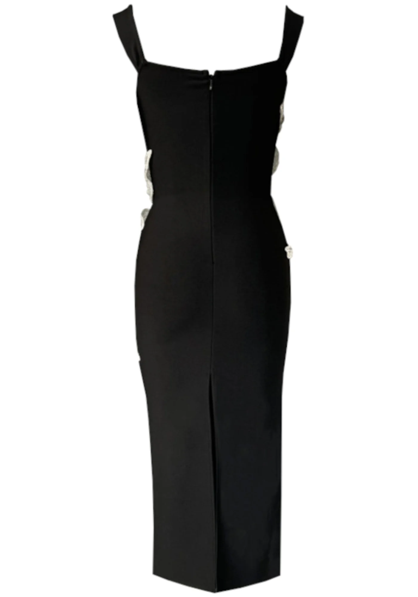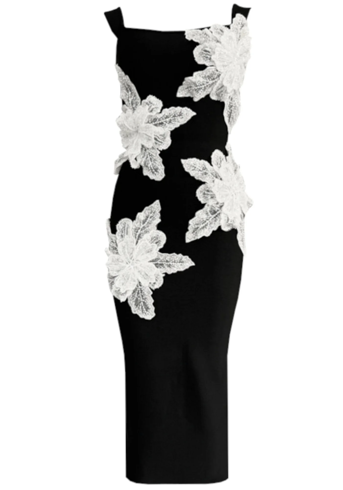 Indulge in the timeless elegance of our black and white floral lace midi dress. This V-neck sleeveless dress features delicate floral details with lace inserts, a concealed zipper at the back, and a mid-calf length for a stunning silhouette. Expertly crafted from 90% Rayon, 9% Nylon, and 1% Spandex blend, this dress offers anti-wrinkle properties, vibrant colors, durability, and high elasticity for a perfect fit. The meticulous sewing and hemming ensure lasting quality, while the YKK zipper guarantees reliability. Care instructions included.