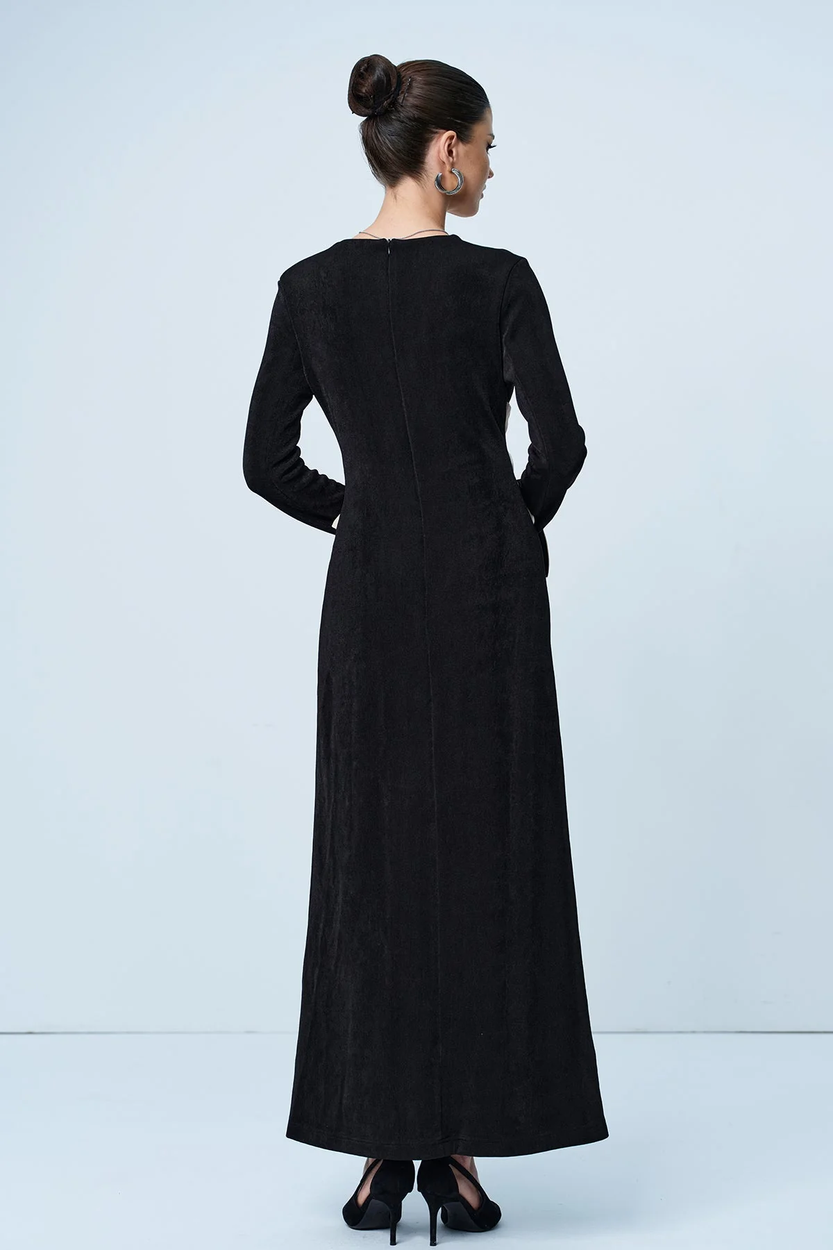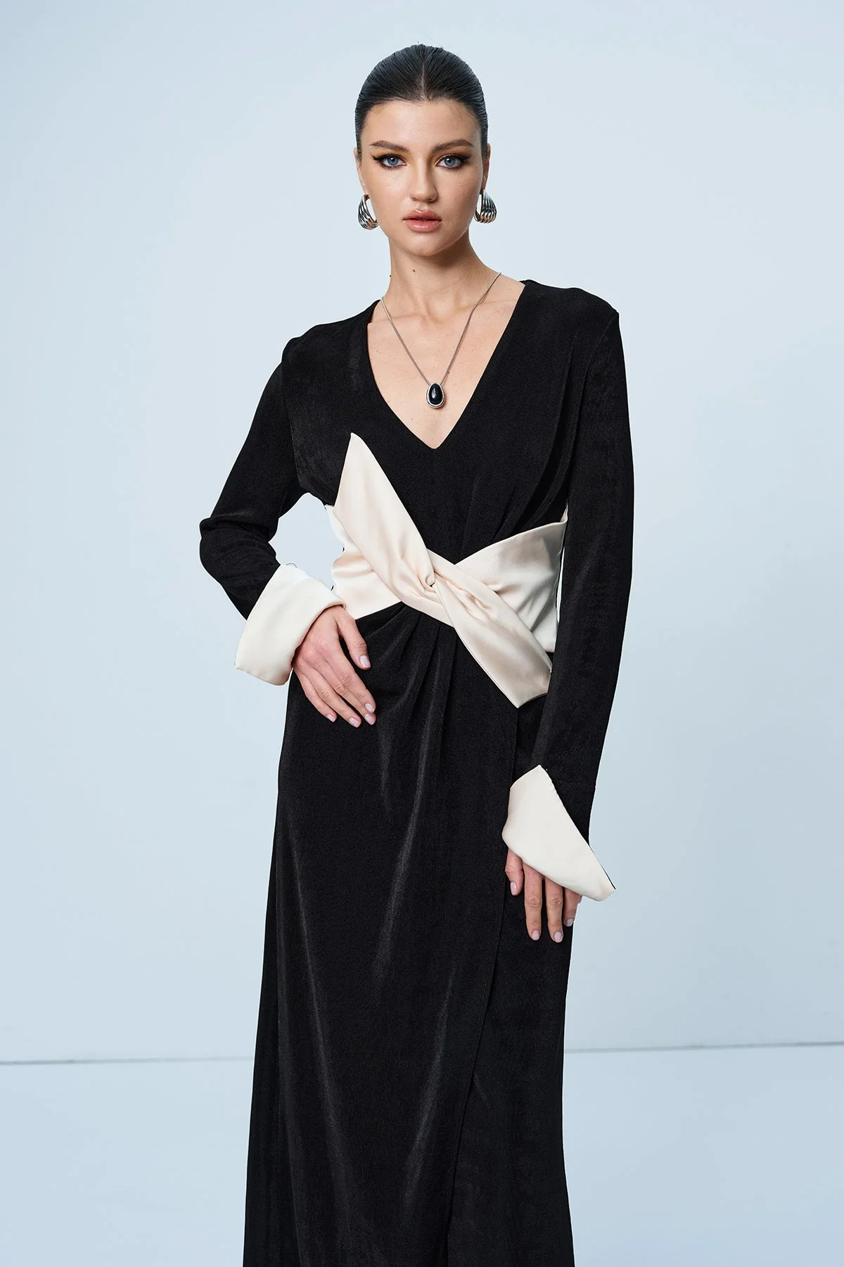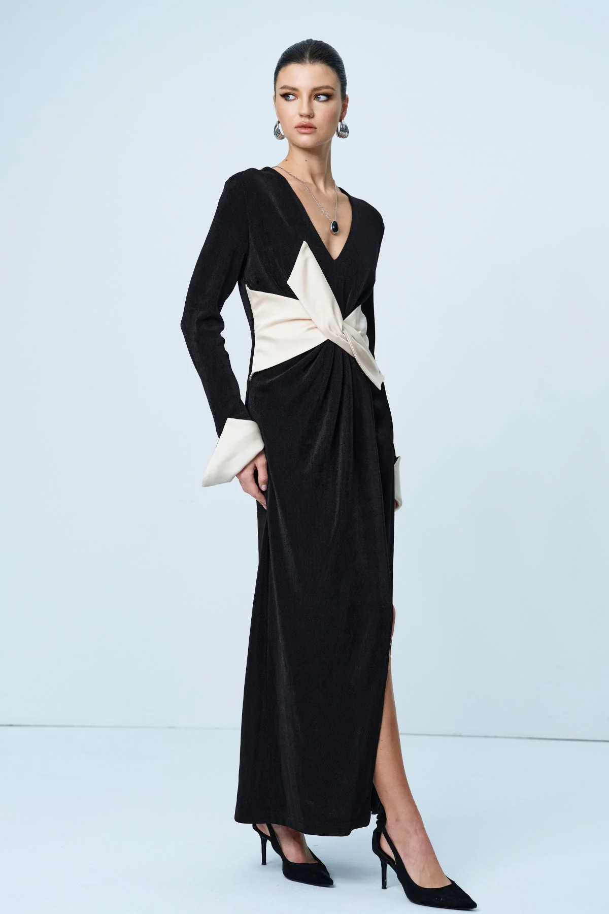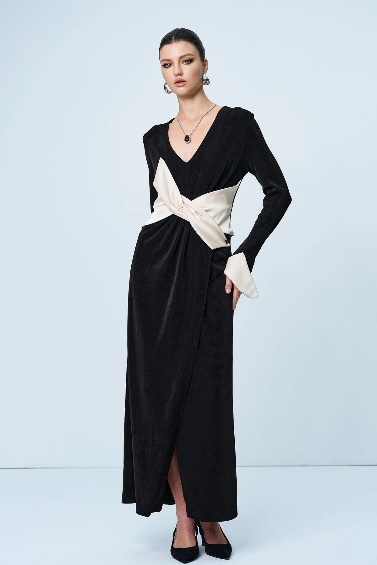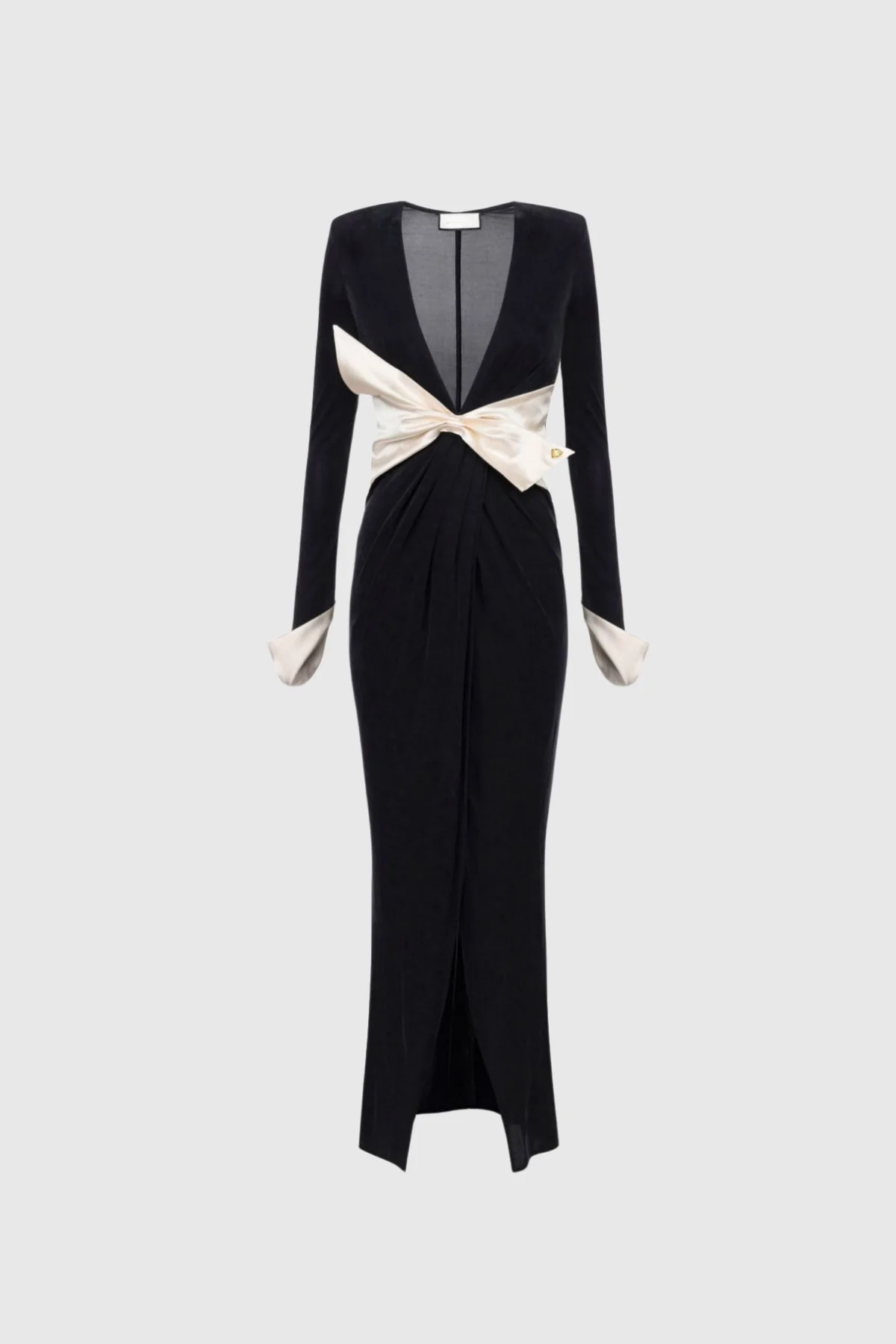Make a statement with this elegant black bow maxi dress featuring a deep plunge neckline and thigh-high split. Perfect for any occasion, this chic essential is made of high-quality materials for comfort and style. The slight stretch ensures a great fit. Material: 50% Polyester, 50% Cotton. Clean: Gentle machine wash. Enhance your wardrobe with this versatile dress that exudes sophistication and allure. Color may vary due to lighting. Images represent the true color.