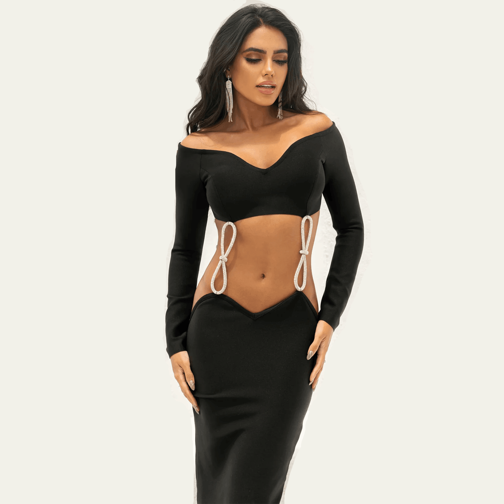 Elevate your style with the Elegant Black Bow Off-Shoulder Bandage Midi Dress. This luxurious dress is designed to accentuate your curves gracefully. The exquisite bow detail and glitter accents add a touch of glamour to any occasion. Crafted from premium-quality bandage material, this dress ensures a comfortable fit while enhancing your silhouette. Whether its a cocktail party or a special event, this versatile dress is your go-to choice. Stand out in sophistication and radiate confidence wherever you go. Make a lasting impression with this stunning wardrobe essential. Explore endless styling possibilities on Instagram @mermaid_way. Material: Polyester, Spandex. Experience unmatched elegance and charm with every wear.