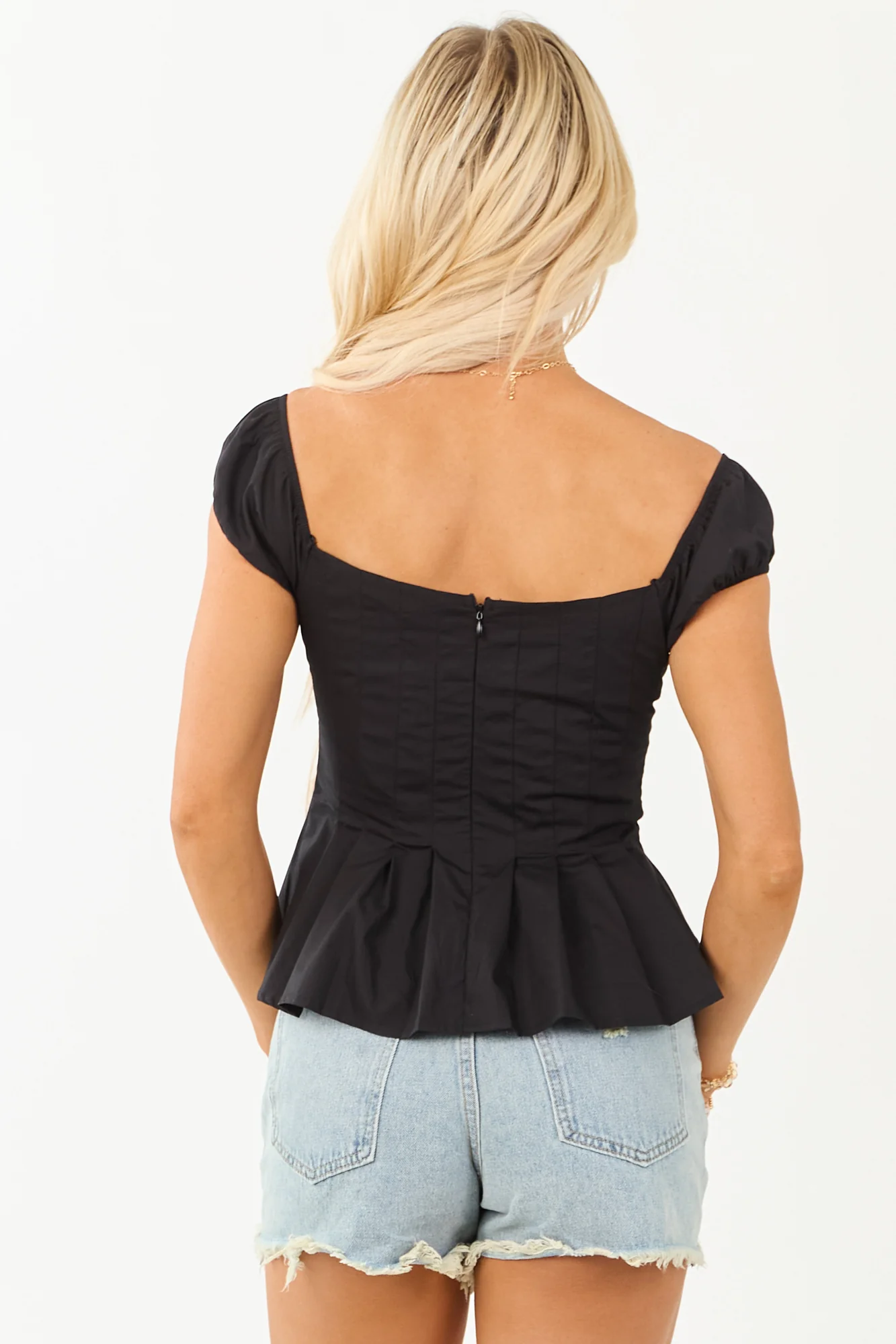 Experience the perfect blend of old-world charm and modern style with this elegant black peplum top. Crafted from non-stretchy lightweight cotton, it features an adjustable front tie, hidden back zipper, elastic shoulders, and cuffs. The top offers a flattering silhouette with an adhesive strip on the bust to prevent slippage. Stay comfortable and stylish in this slightly sheer top crafted from 100% imported Cotton. Available in sizes S, M, L. Model is wearing size S. Perfect for various occasions, the lined bust ensures a sophisticated look. Model Measurements: Size 3, Height 57″, Bust 35″, Waist 26″.