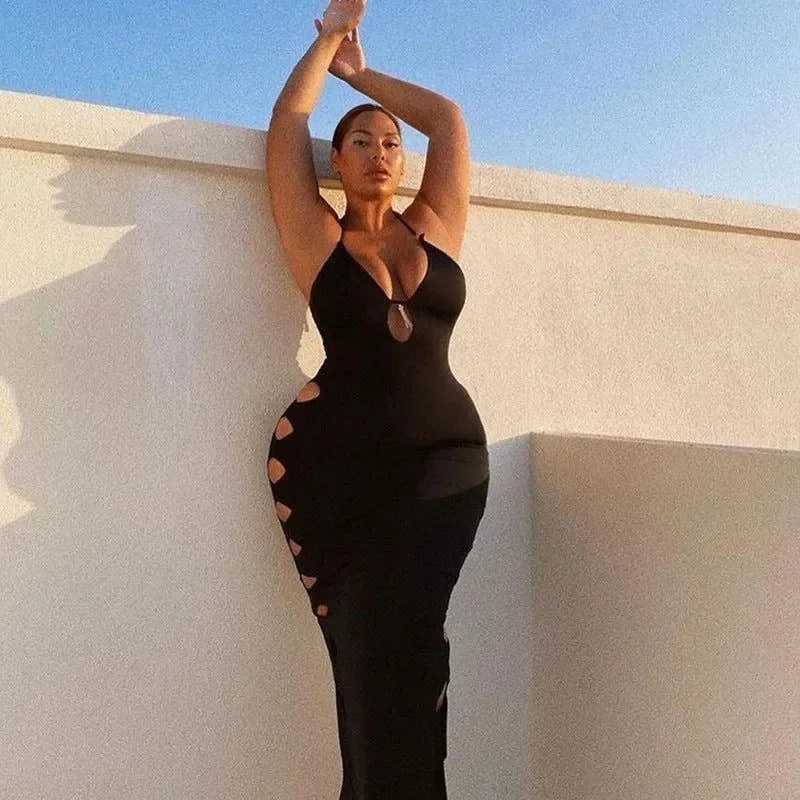 Indulge in the modern sophistication of this elegant black cut out maxi dress crafted with a sleek design. The thoughtfully placed cutouts and high slit enhance its unique style and chic appeal. Made of polyester and spandex, the flowing fabric drapes gracefully for comfort and elegance, perfect for galas or evening events. Explore outfit inspirations on Instagram @mermaid_way. Enjoy a complimentary exchange for a different size if needed.