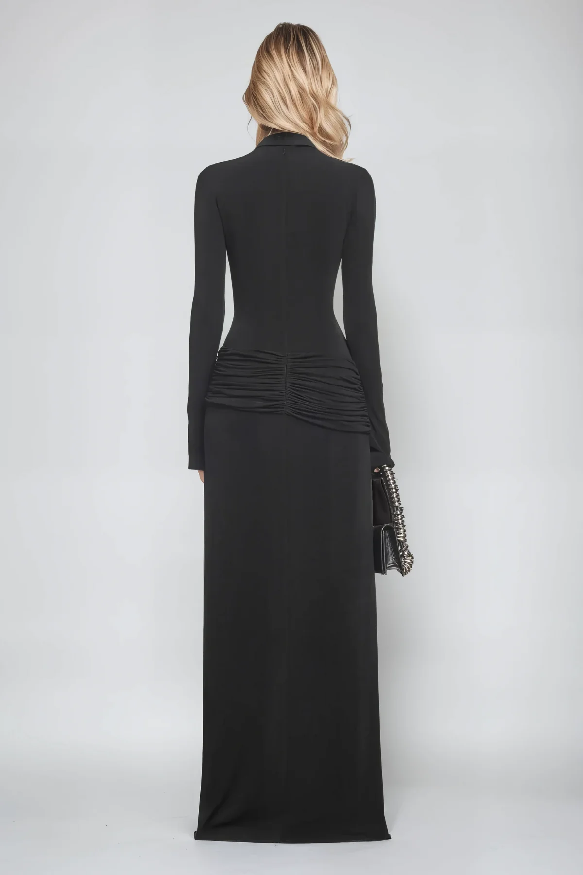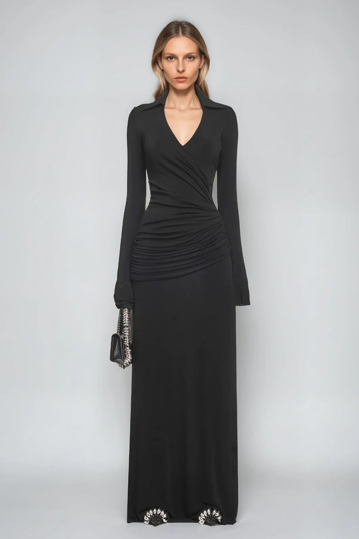 Indulge in sophistication with our Elegant Black Lapel Maxi Dress that merges style and comfort seamlessly. This versatile dress features a ruch lapel design, elevating your wardrobe effortlessly. Crafted from a high-quality blend of 50% Polyester and 50% Cotton, it offers a slight stretch for all-day wear. Discover the perfect blend of elegance and comfort to enrich your style. Color variations may occur under different lighting conditions. Incorporate this chic essential to accentuate your look today.