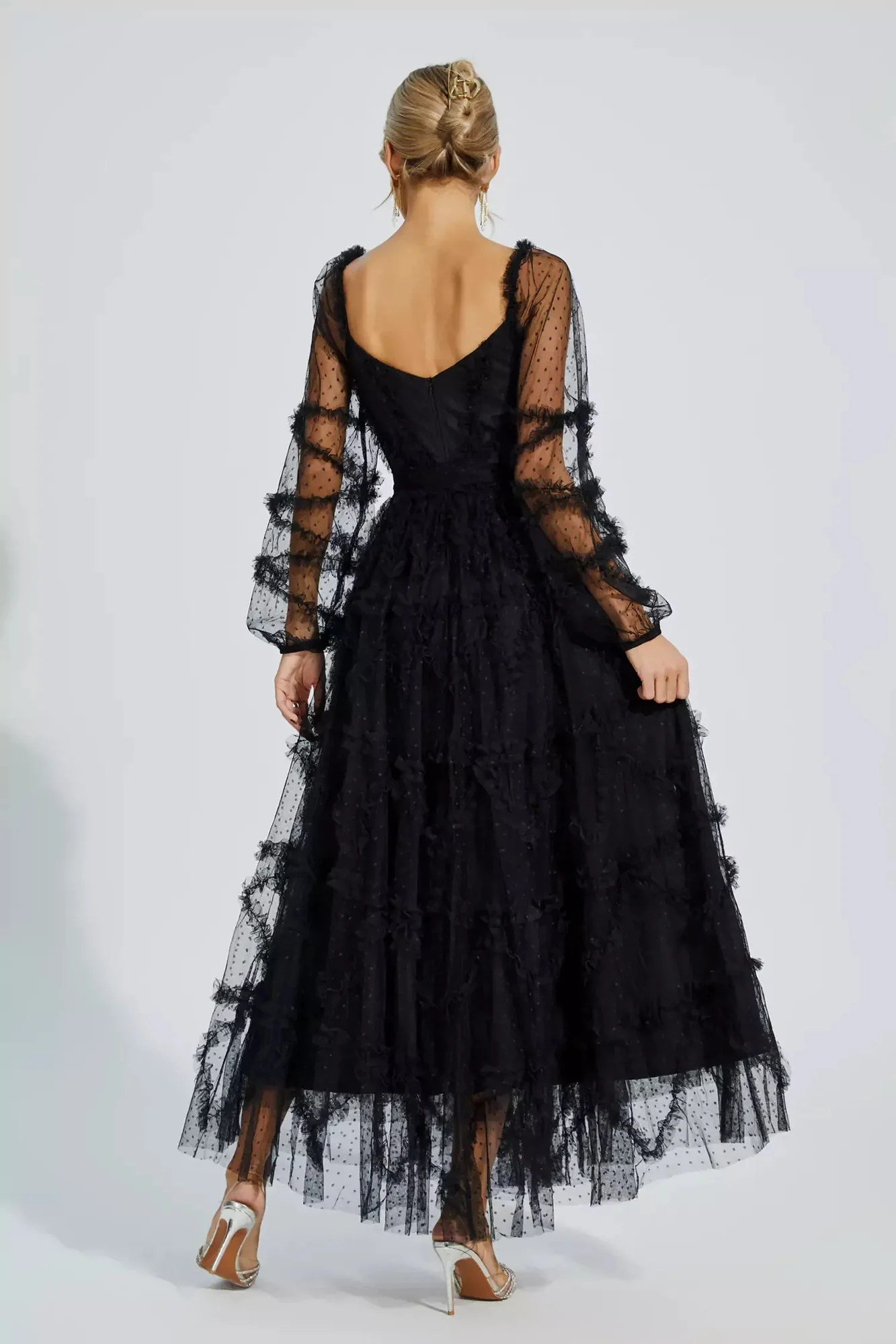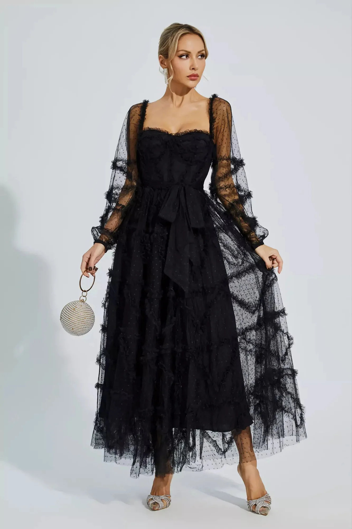 Make a stunning entrance in the elegant Black Mesh Bridesmaid Maxi Dress featuring beautiful pleats, bow accents, and a length of approximately 135cm. Crafted from breathable polyester fabric, this dress is perfect for weddings and special banquets. Pair it with heels for a glamorous look. This dress runs true to size, so consult our size chart for the ideal fit. Look your best with this graceful dress!