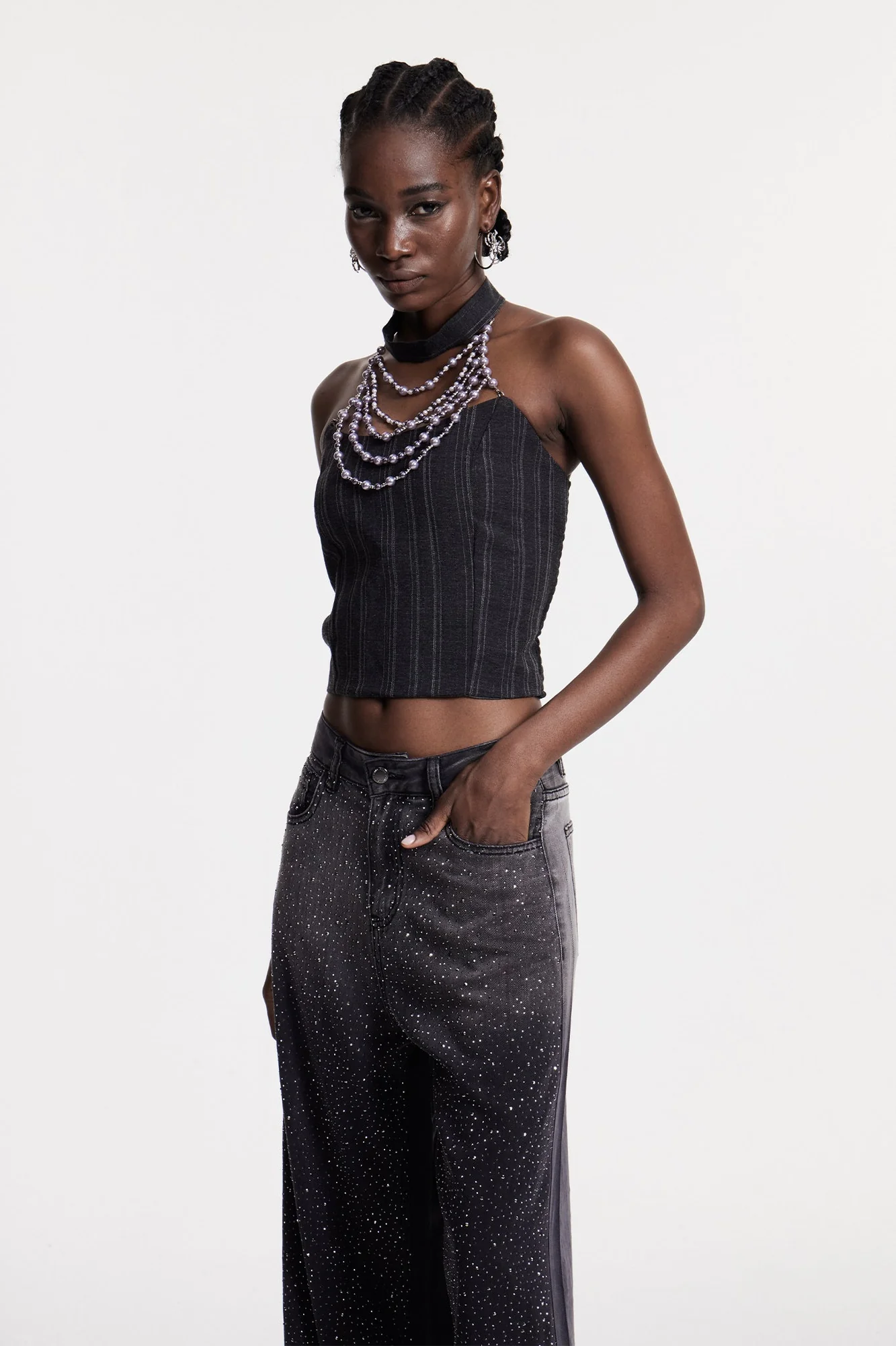 Indulge in sophistication with the Elegant Black Pearl Halter Top. This modern design boasts a refined halter neckline embellished with delicate pearls, offering a flattering fit that enhances your silhouette. Perfect for upscale occasions and casual chic looks, this top adds a timeless charm and subtle touch of luxury to your wardrobe. Our non-stretch fabric ensures comfort and style, elevating your outfit effortlessly. Discover the perfect blend of elegance and comfort today. Color may vary under different lighting conditions. Gentle machine wash recommended.
