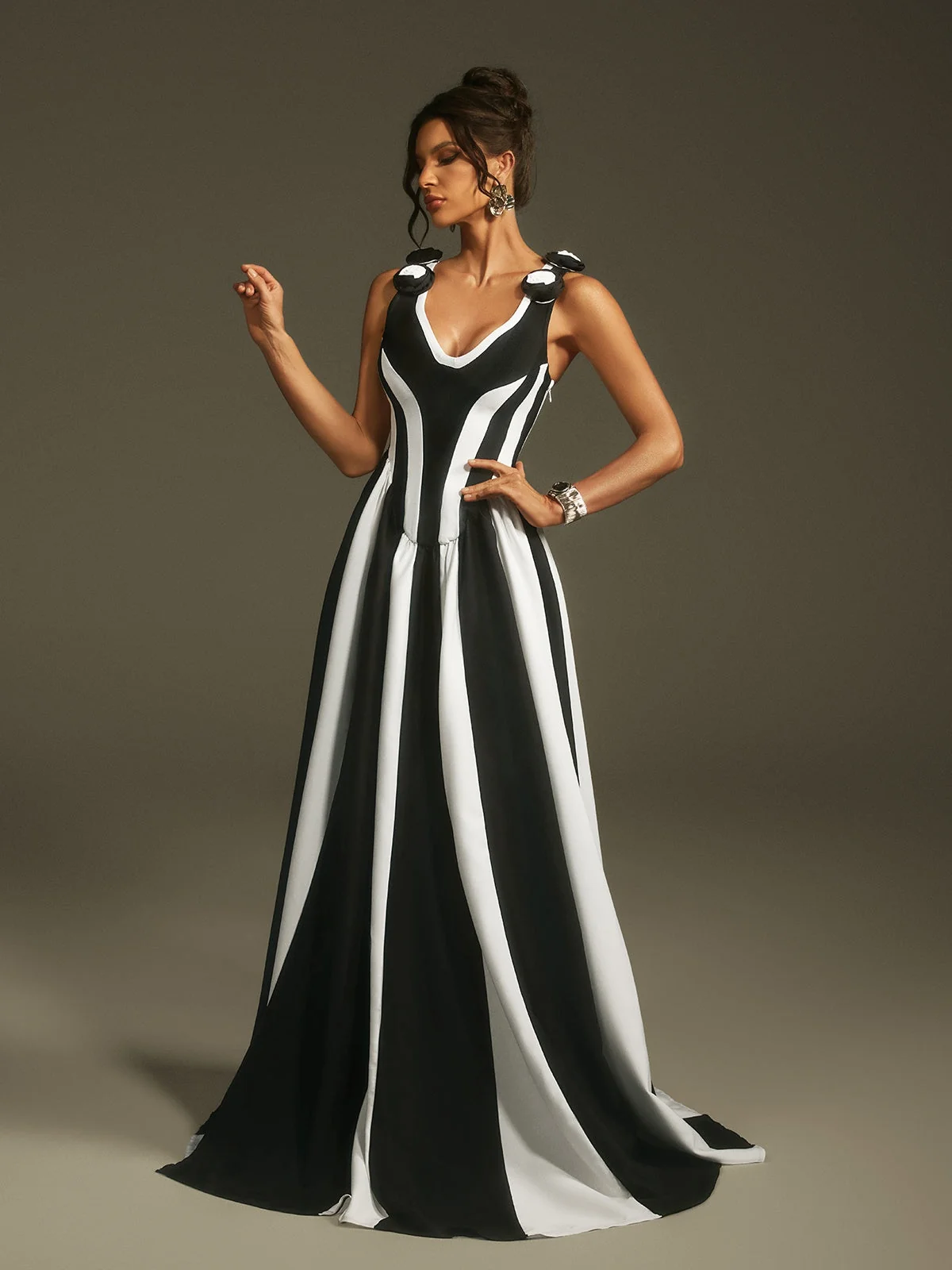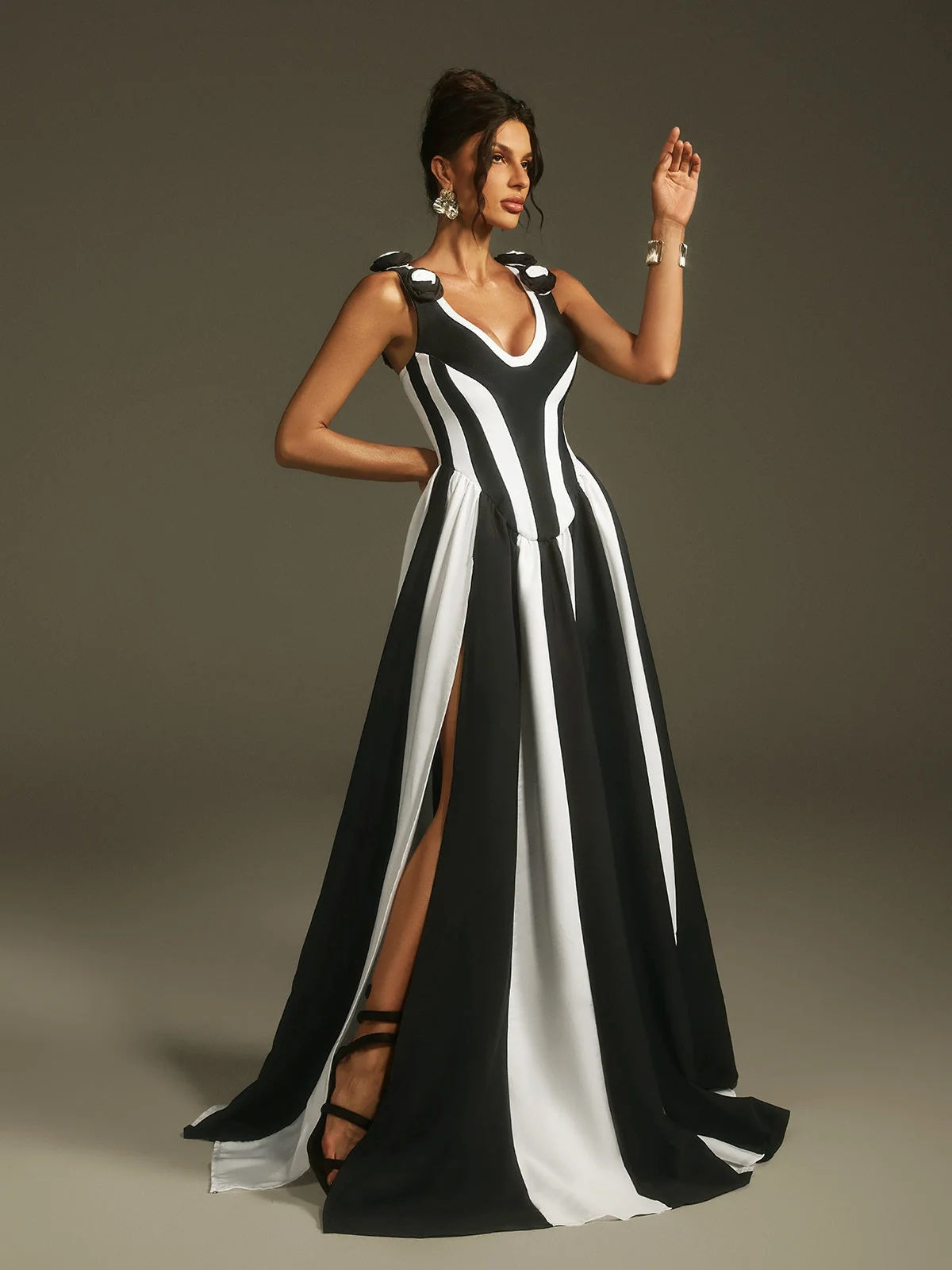 Indulge in elegance with this Black Plunge Neck Maxi Dress designed to exude confidence and style. The striking plunge neckline and high side slit create a graceful silhouette for a memorable look. Whether for special occasions or glamorous nights, this polyester dress adds sophistication and allure to your wardrobe. Enjoy the slight stretch comfort and easy care for a stunning outfit choice that stands out. Color variations exist due to lighting. Model wears size S. Dry clean only.