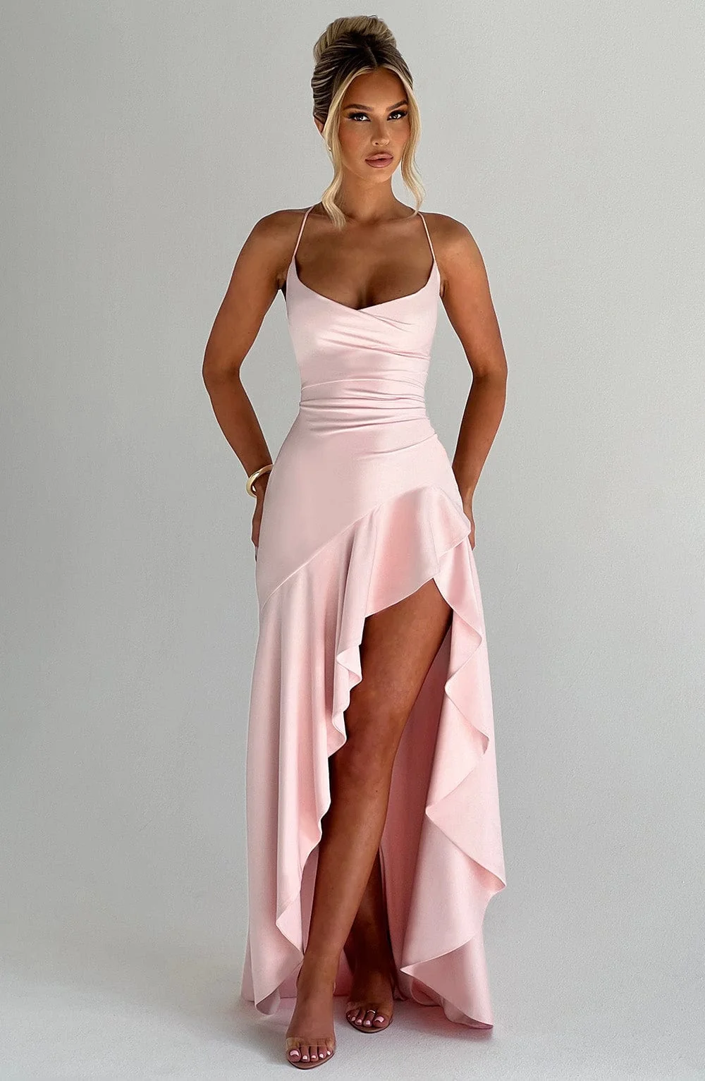 Indulge in the refined elegance of the Elegant Blush Satin Cowl Neck Maxi Dress. Crafted from luxurious satin, this dress glides gracefully over your body. The twist cowl neckline adds a touch of allure, while the high-low hem with cascading ruffle and thigh-high split exudes sophistication. Featuring an adjustable crossover lace-up back for a custom fit, this dress is perfect for effortless movement and confidence. Complete the look with nude heels and a sleek clutch for a chic ensemble. Color: Blush. High-low hemline. Fully lined. Adjustable crossover lace-up back. Twist cowl neckline. Frilled skirt. Thigh-high split. Invisible zipper closure.