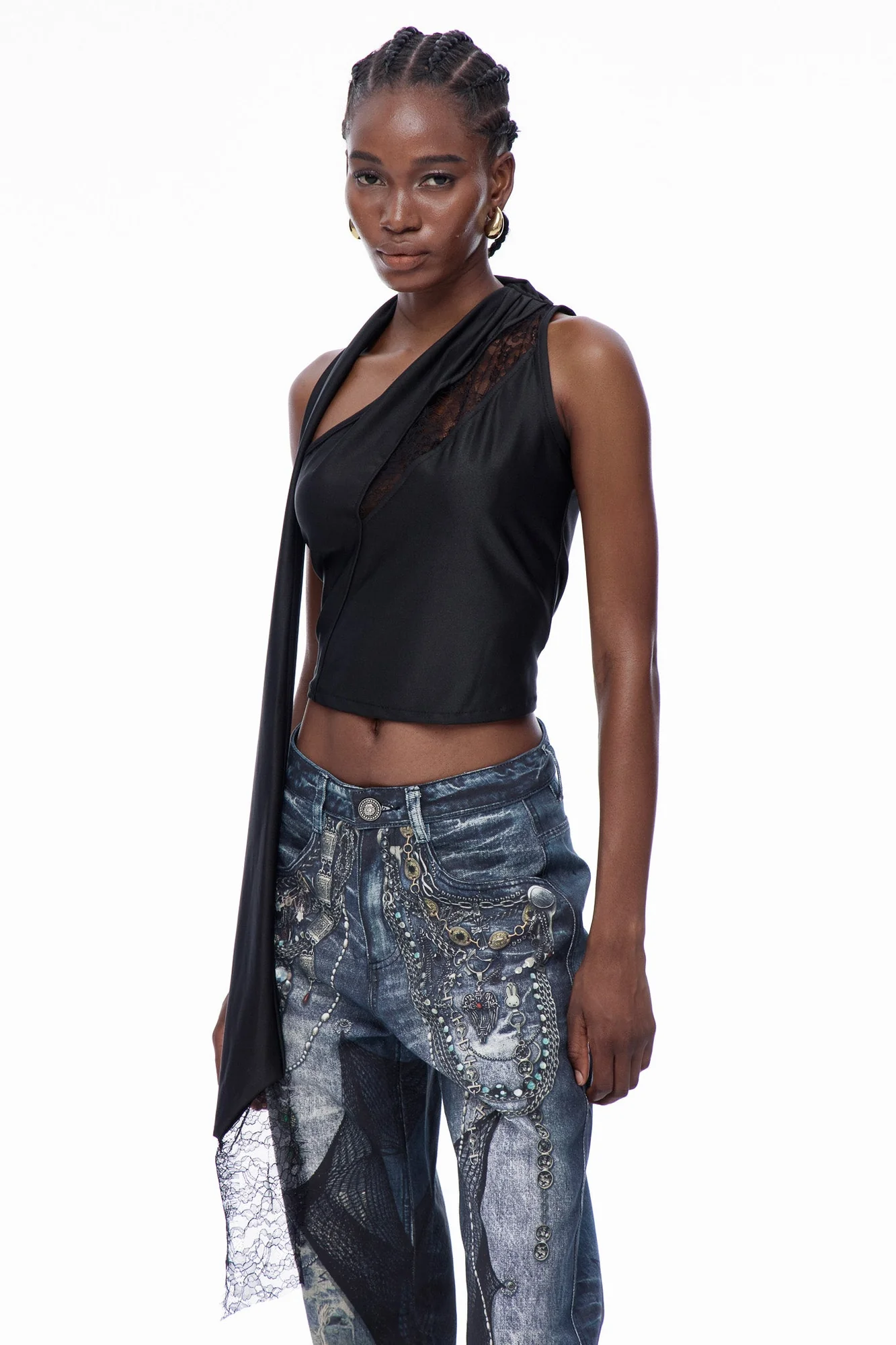 Elevate your wardrobe with our elegant Carlo Lace Satin Top in black. Expertly crafted blending modern design with delicate lace cutouts on smooth satin fabric for a luxurious feel. The tailored fit enhances your silhouette, perfect for formal occasions and stylish wear. Experience refined comfort and timeless style in one versatile piece thats a chic essential. Color may vary due to lighting. Gentle machine wash recommended.