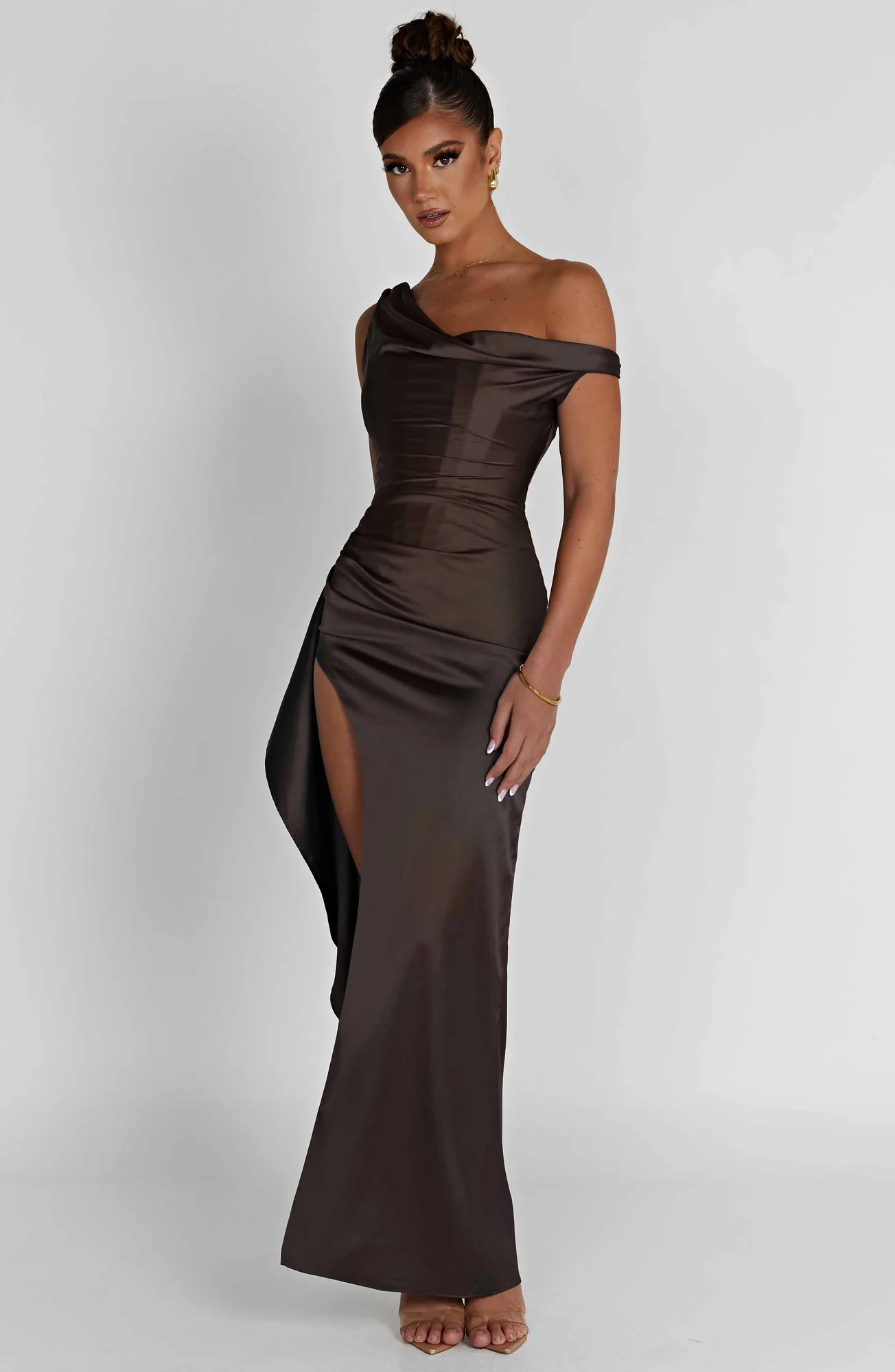 Indulge in the timeless allure of the elegant Charcoal Maxi Dress. Crafted from sumptuous bias cut satin, featuring a figure-enhancing built-in corset, asymmetric neckline, and thigh-high split detailing. The luxurious design includes an elegant drape detail, guaranteed to make you feel exceptionally special at any event. Embrace the glamour of satin without sacrificing comfort. Perfect for weddings, evening events, formals, proms, and more. Available in sizes XS to XXL.