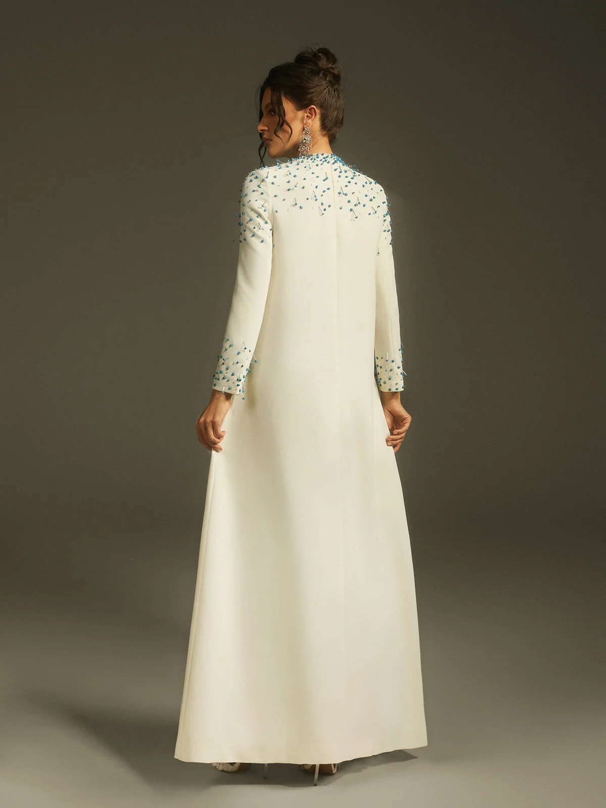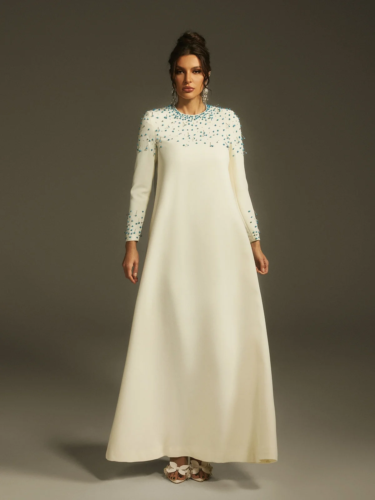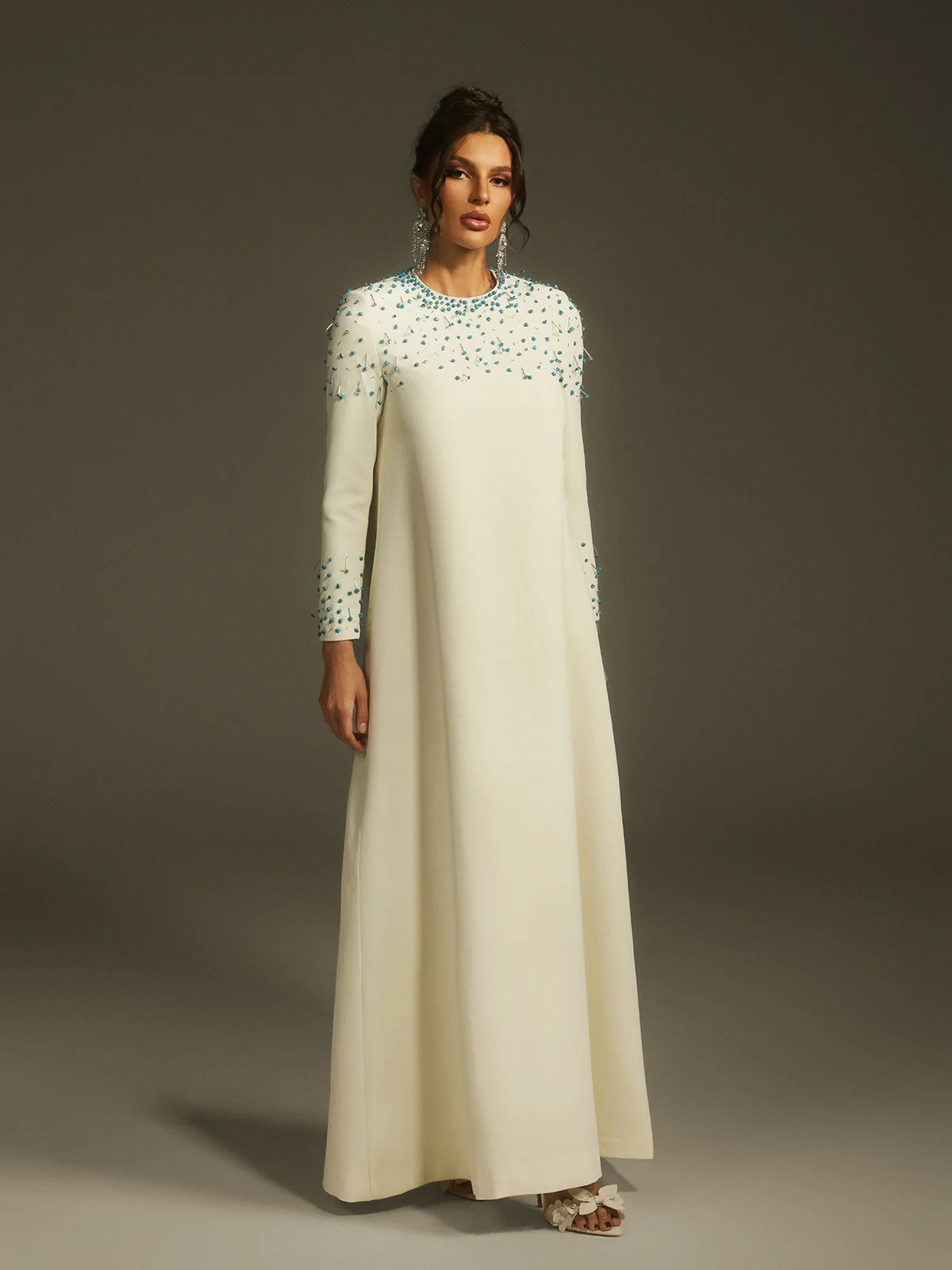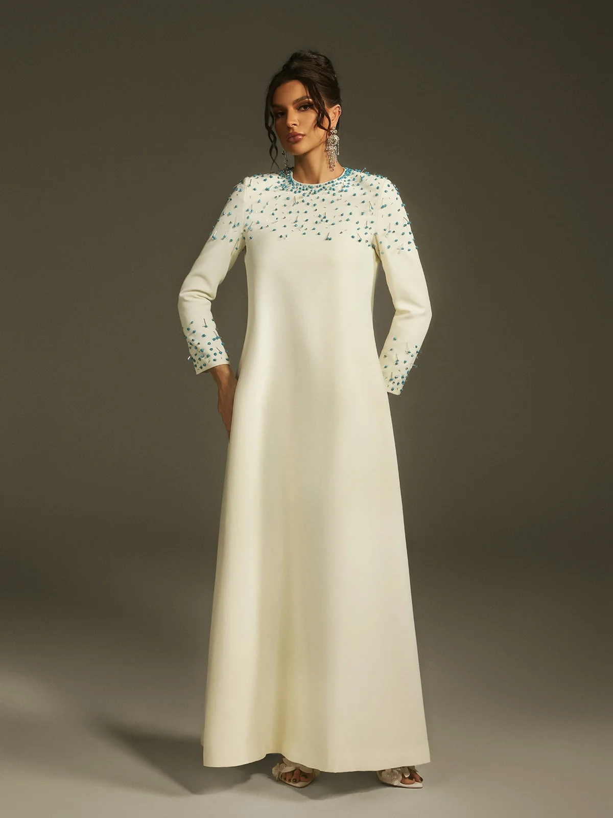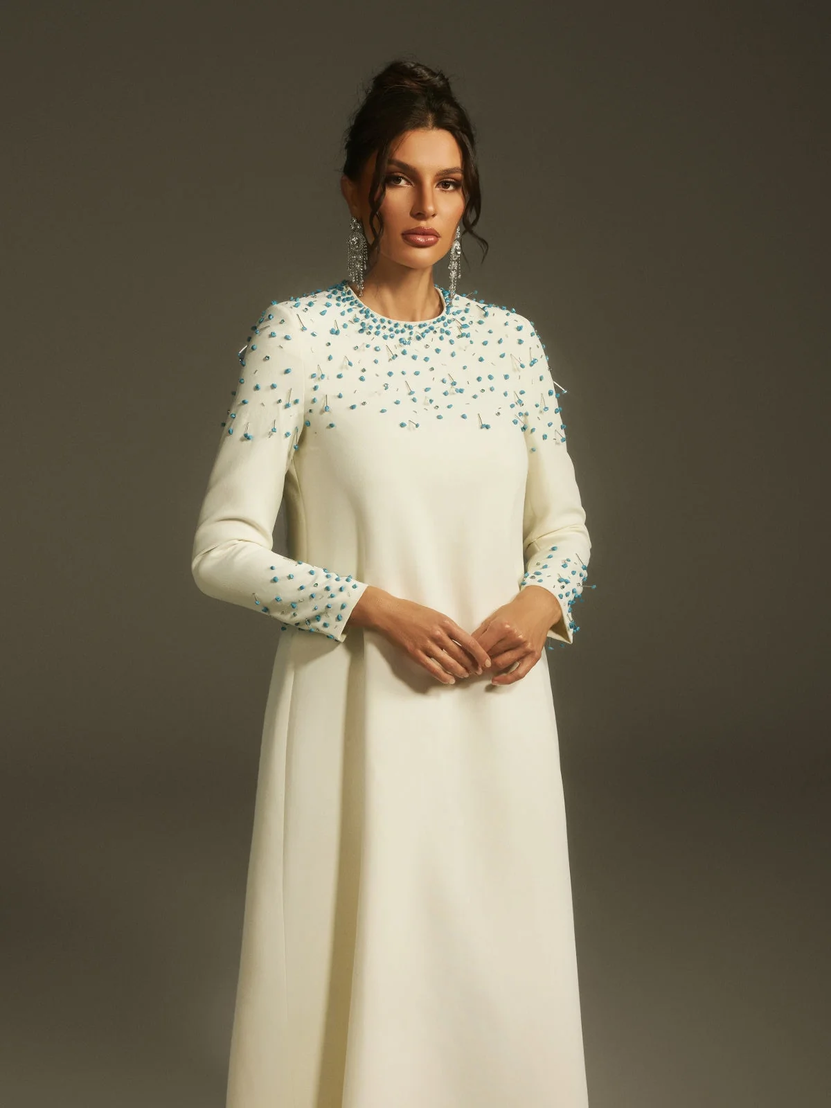Elevate your elegance with our stunning Crystal Embellished Maxi Dress. This dress boasts a graceful silhouette adorned with shimmering crystals for a touch of glamour. The long sleeves and flowing maxi length ensure both refinement and comfort. Ideal for special occasions, this dress exudes classic charm with a modern twist. Crafted from 100% polyester with a slight stretch, featuring an invisible zipper for a seamless finish. Dry clean only. Please note, color may vary due to image lighting. Available in sizes S, M, L, XL, and XXL. Model is wearing size S.