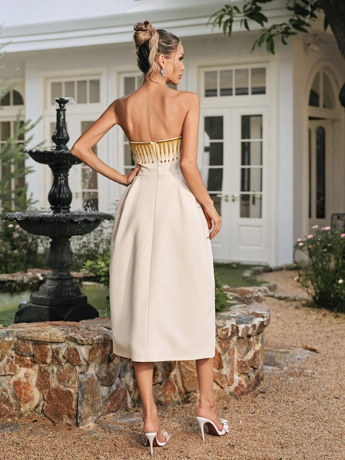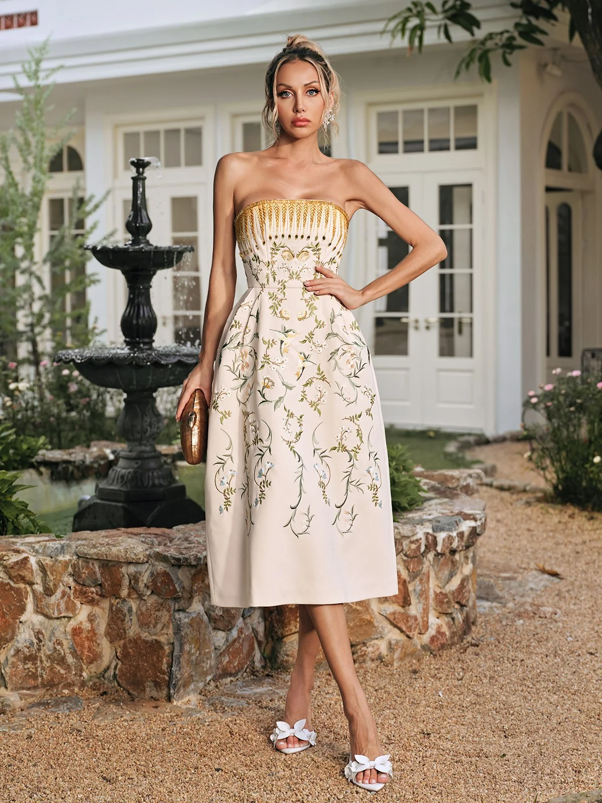 The Elegant Embroidered Strapless Midi Dress seamlessly blends timeless elegance with intricate craftsmanship. Its strapless design beautifully accentuates your neckline and shoulders, while the delicate embroidery adds a touch of refined artistry. Ideal for weddings, parties, and upscale gatherings, this midi dress offers a flattering fit that enhances your silhouette, ensuring you feel confident and graceful throughout the day or night. Whether its for a special occasion or making everyday moments memorable, this versatile dress is a wardrobe essential. Crafted from high-quality 100% polyester for a luxurious feel, it features an invisible zipper opening at the back and offers a slight stretch for comfort. Dry clean only for best care results. Please note that the actual color may vary due to lighting effects during photography. Model displayed is wearing an S size.