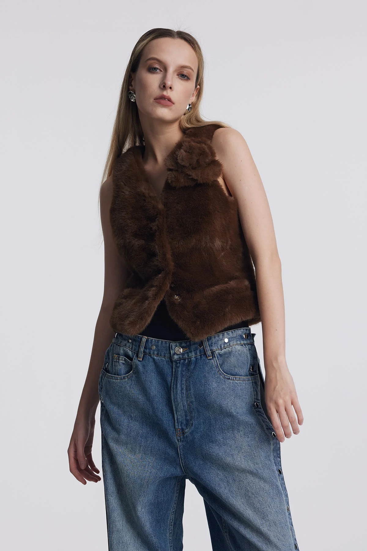 Elevate your style with the elegant Faux Fur Flower Sleeveless Jacket in Brown. Crafted with luxurious faux fur, this chic jacket features delicate flower details on the sleeves for a touch of sophistication. Stay warm, stylish, and make a statement with this must-have outerwear piece. The jacket is made of 50% Polyester and 50% Cotton, ensuring comfort and style. This non-stretch jacket is easy to care for with a gentle machine wash. Please note that the color may vary slightly due to lighting in images. Discover the perfect blend of elegance and warmth with this stylish jacket.