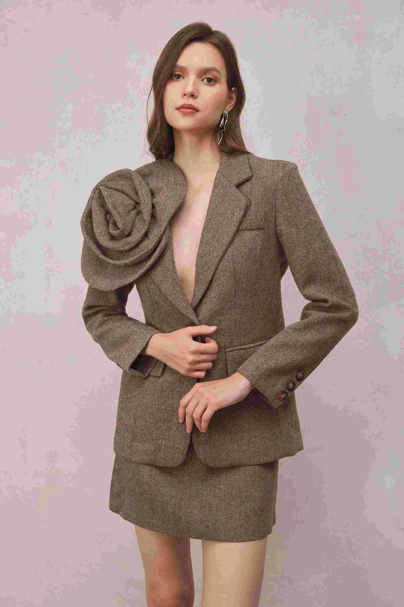 Elevate your style with our elegant floral embellished jacket in brown. Crafted with intricate flower details, this jacket adds a touch of sophistication to any outfit. The unique design makes a bold statement while ensuring warmth and comfort. Ideal for those who seek sophistication with a touch of flair. This jacket is made of 100% Polyester and is recommended for dry clean only to maintain its quality. Please note, the color may vary slightly due to lighting in images.