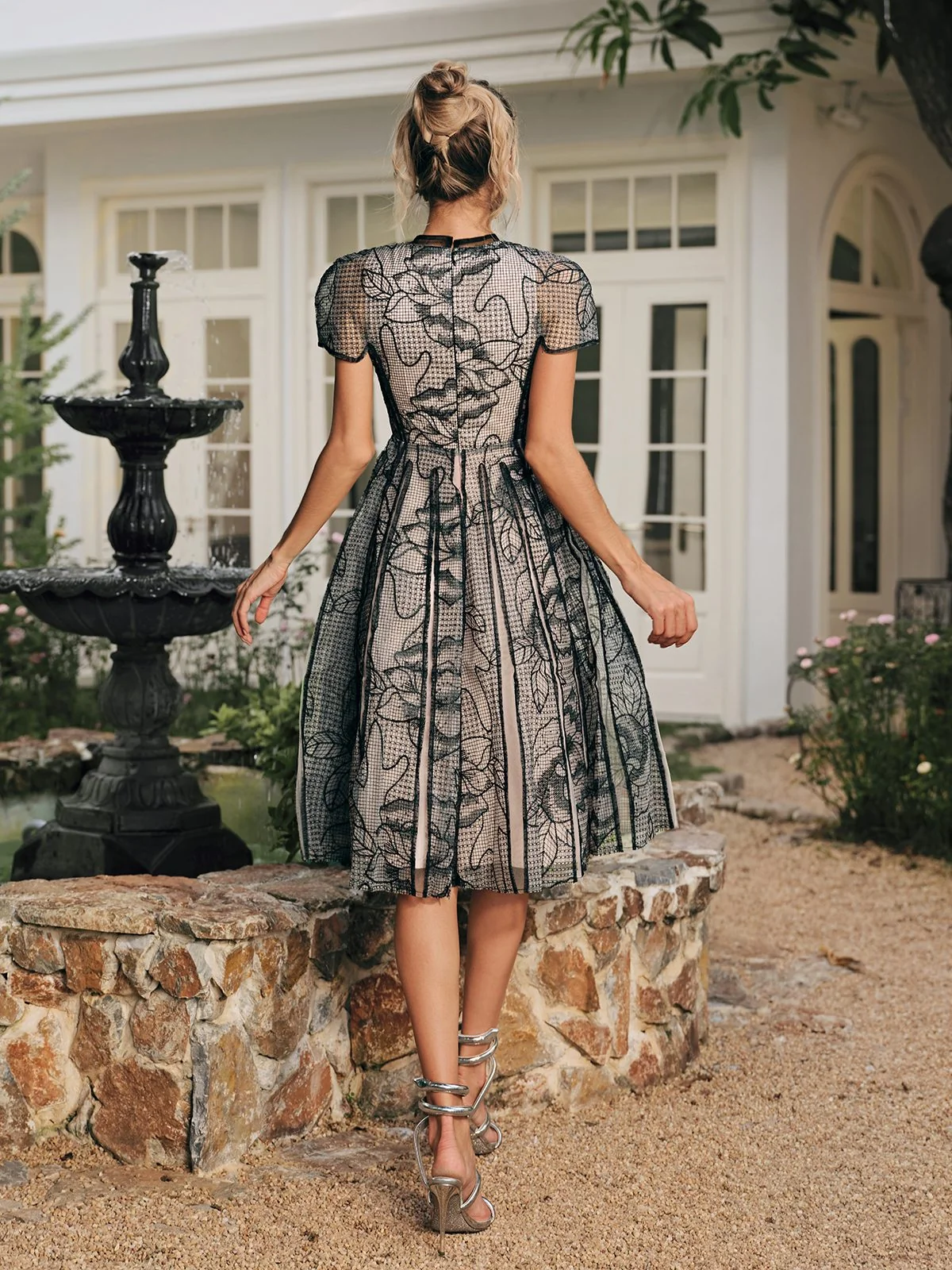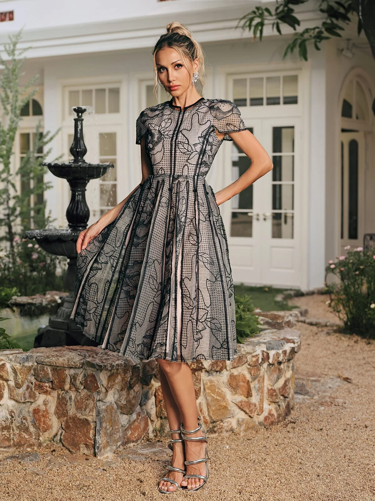 Indulge in the elegance of our black midi dress featuring intricate floral embroidery that exudes charm and sophistication. Crafted from 100% Polyester with a hint of stretch, this dress is designed to complement your grace and ensure comfort on any occasion. Elevate your style game effortlessly with this piece that combines sophistication and timeless charm. This dress features an invisible zipper at the back for convenience. Please note that color may vary due to lighting. Dry clean only.
