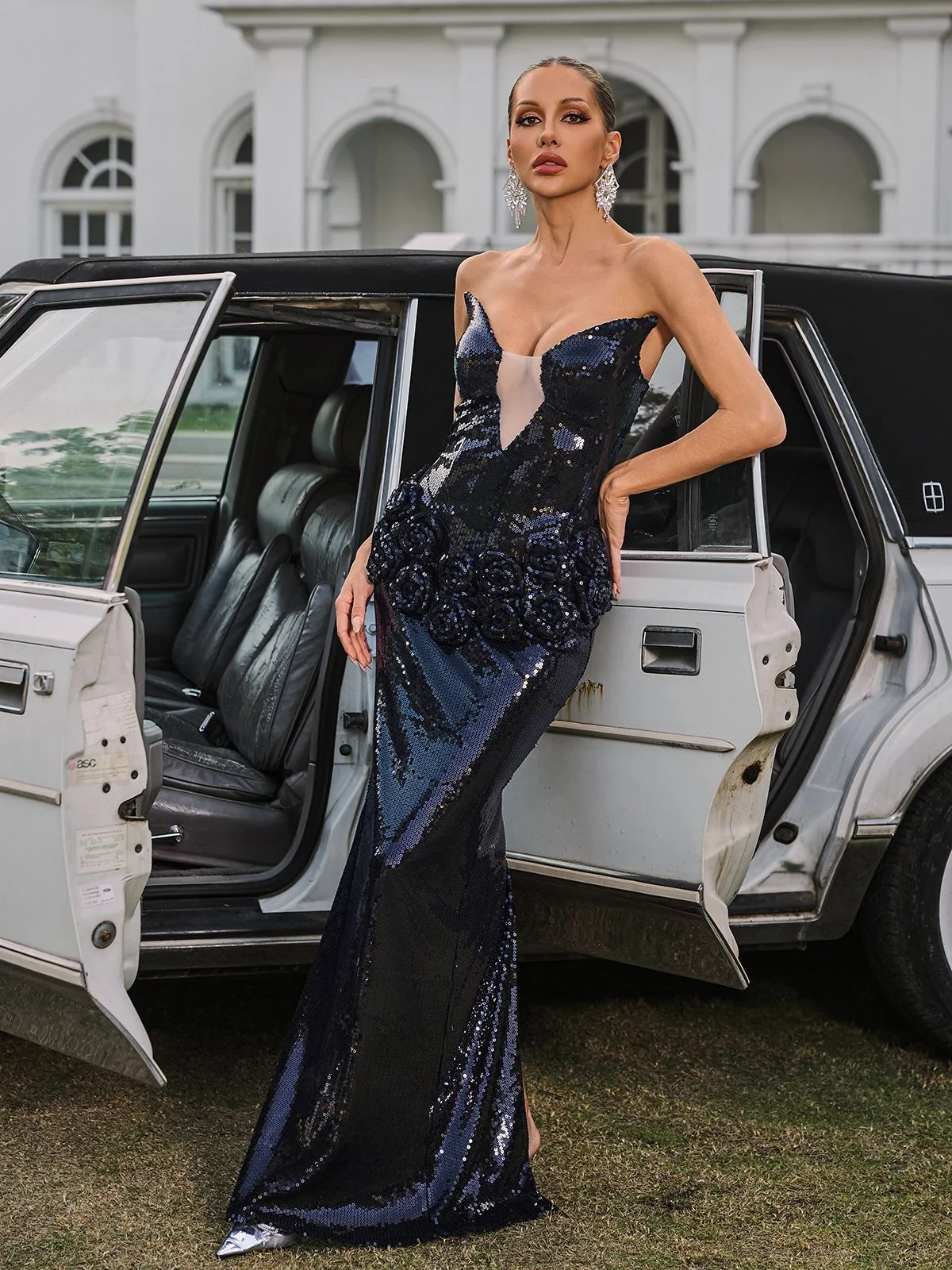 Make a statement with our elegant Flower Sequin Maxi Dress in glamorous black. Perfect for any special event, this dress features intricate flower sequin detailing, a sophisticated strapless design, and a stunning maxi length. Feel confident and stylish in this must-have piece crafted from 100% polyester. Additional details include an invisible zipper at the back, non-stretch construction, and a recommendation for dry clean only. Radiate elegance in our S size Althara dress!