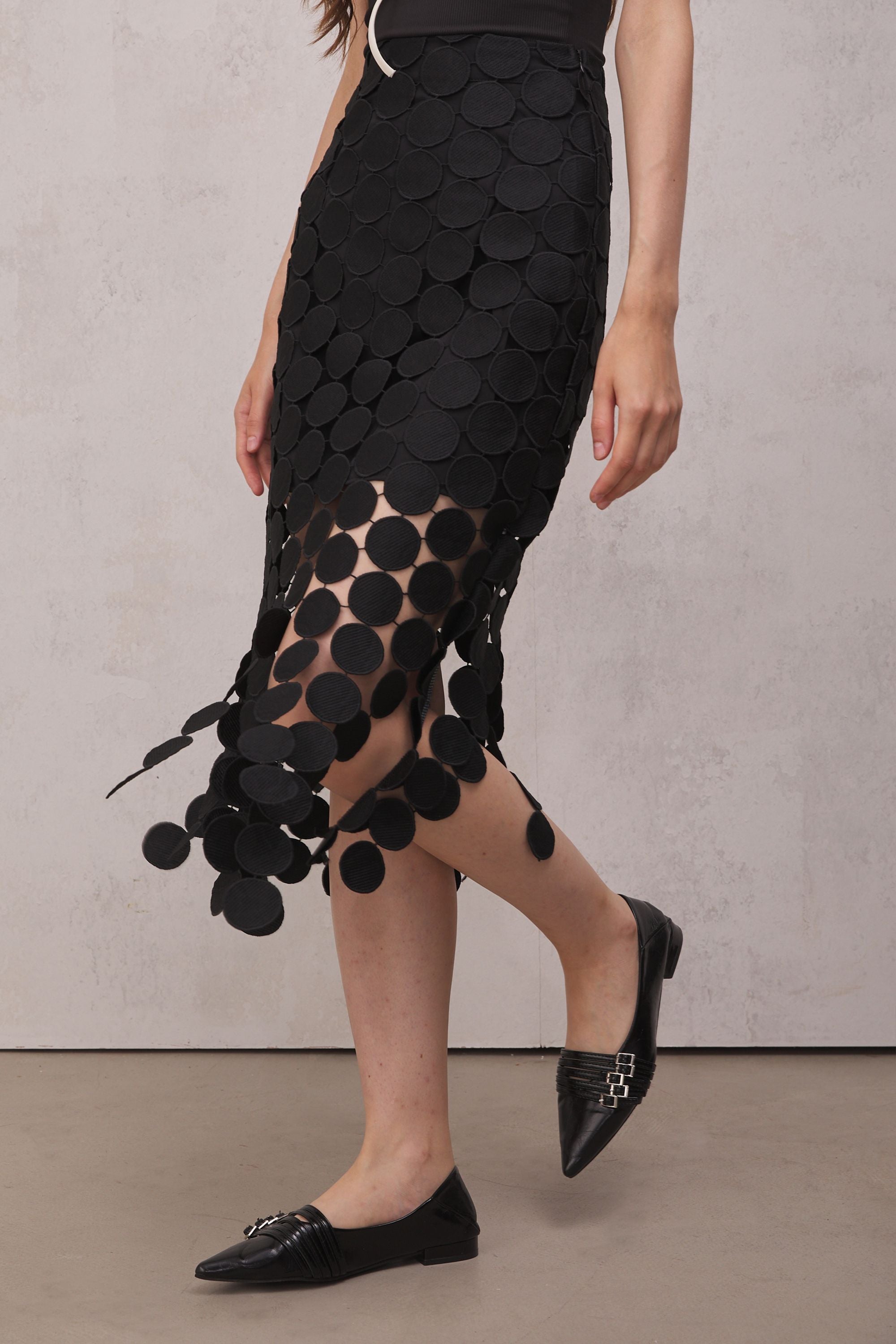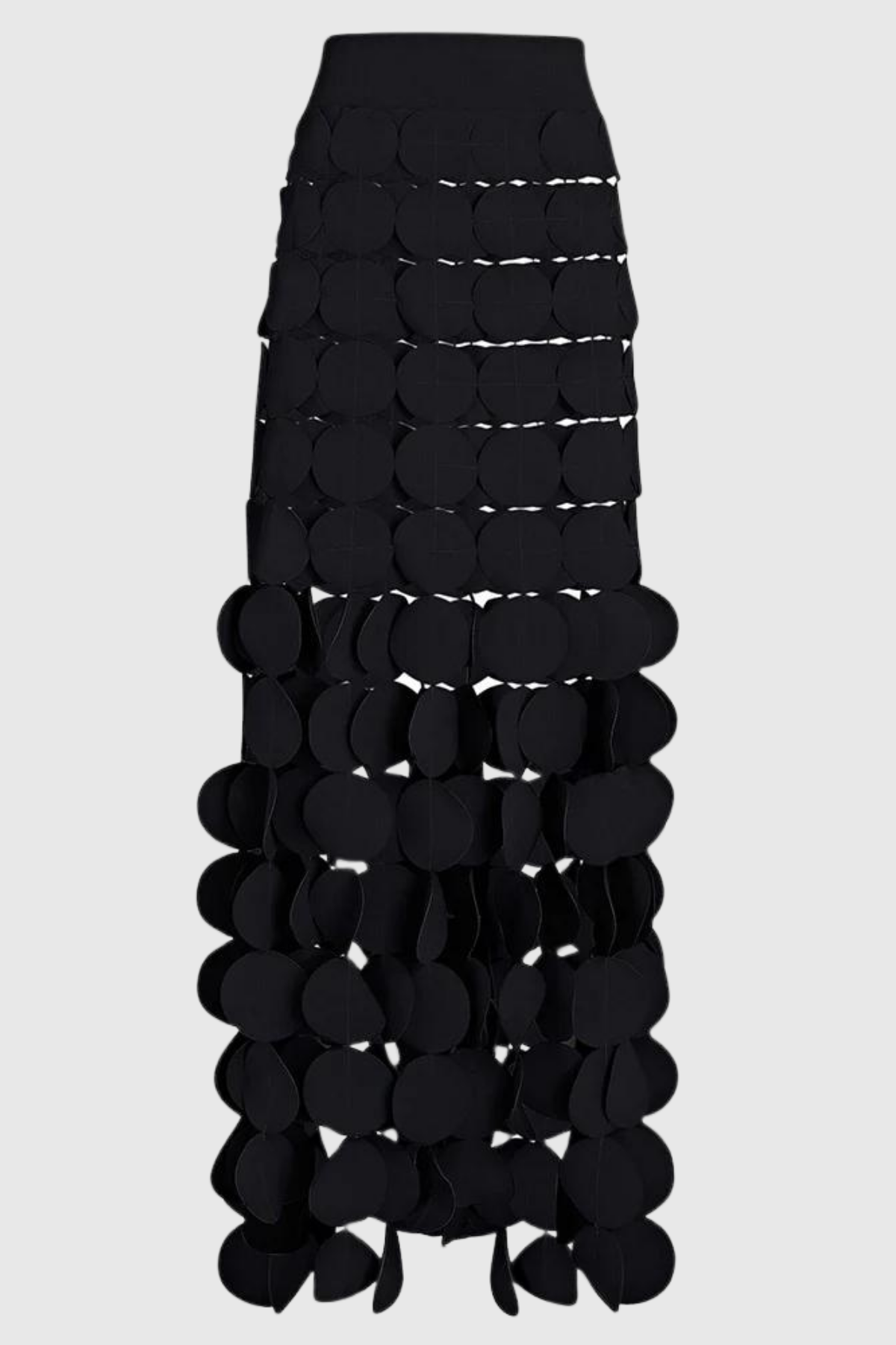 Indulge in luxury with the Elegant Fringe Maxi Skirt in Black. This exclusive skirt features delicate fringe detailing, adding sophistication to any outfit. Made of premium polyester, this flowy silhouette skirt is a chic essential for your wardrobe. Elevate your style with this timeless grace piece that ensures comfort and style. The skirt may run small; if in between sizes, it is recommended to size up. Color may vary slightly due to lighting in images. Gentle machine wash recommended for cleaning.