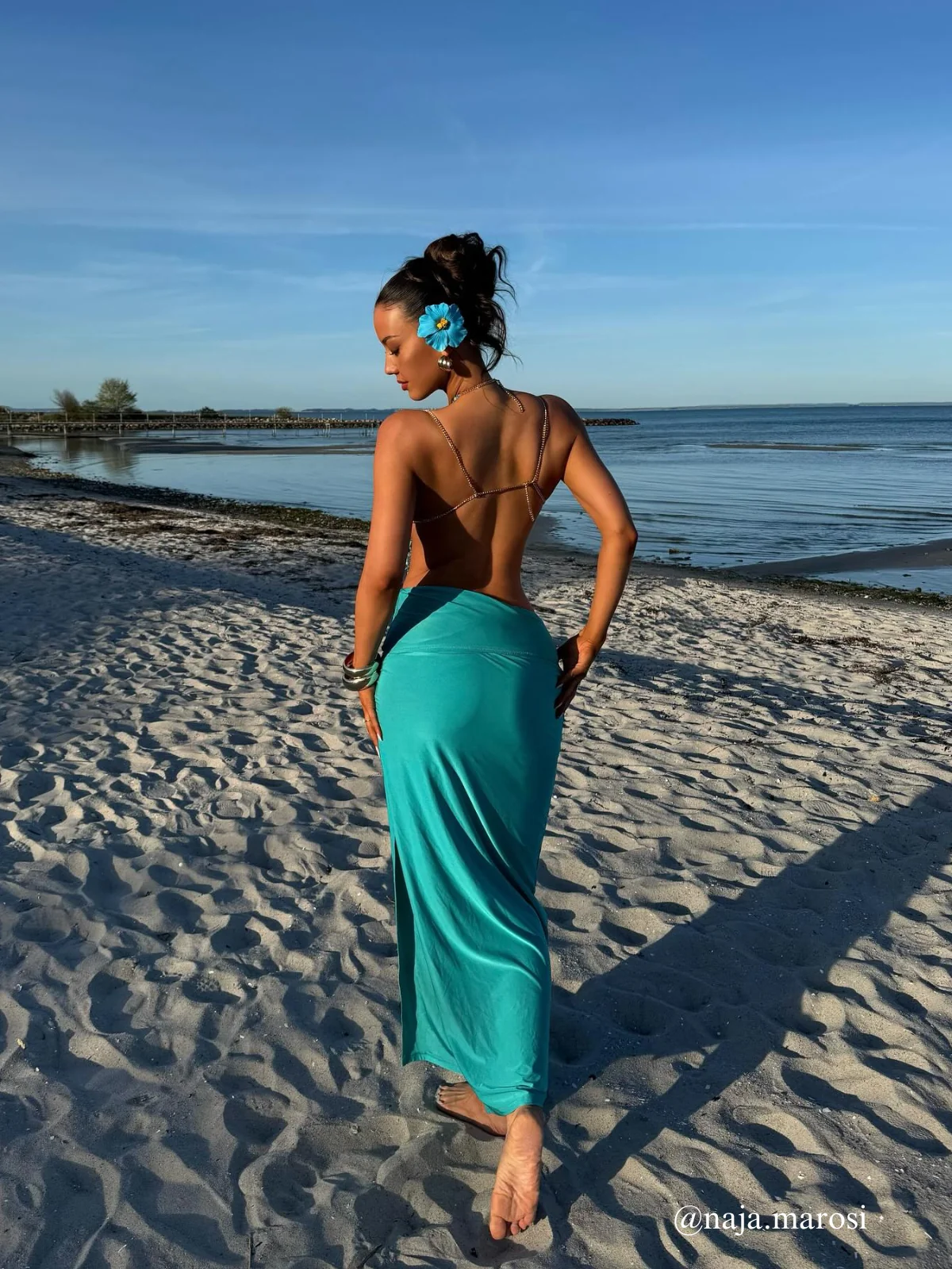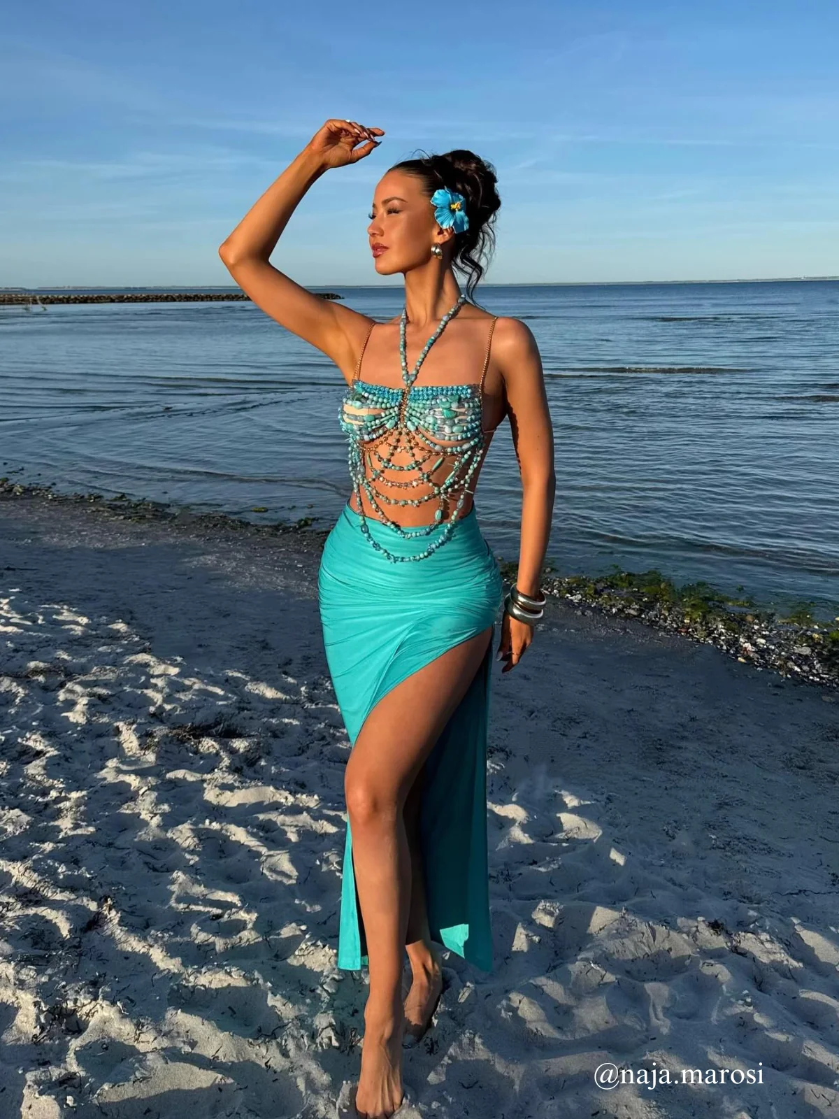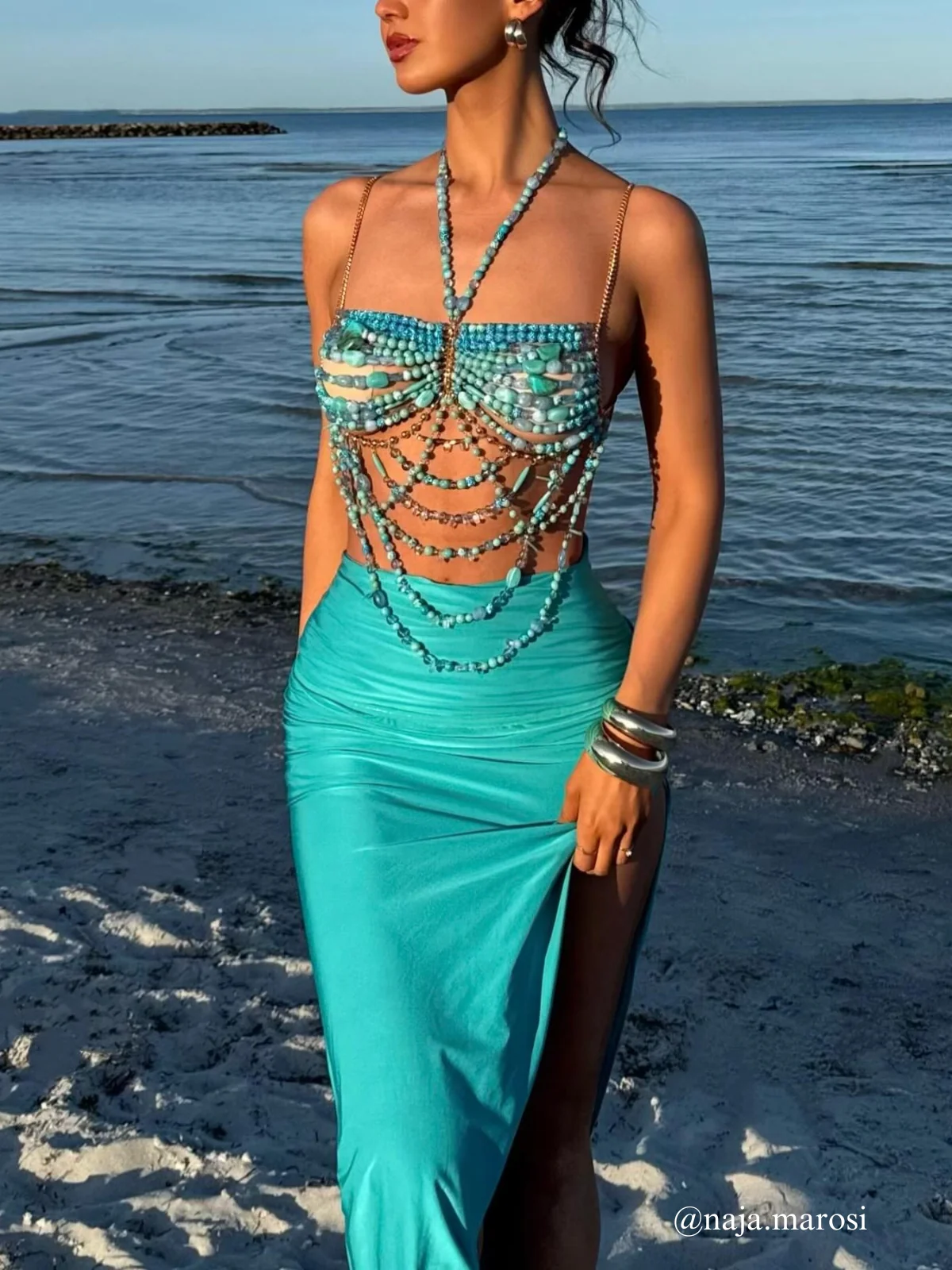 Indulge in the luxury of the Conrad gemstone beaded bralette, expertly designed with draped gemstone beads for a touch of elegance. Elevate your style with this high-quality, non-stretch polyester piece that adds a stunning statement to any outfit. Hand wash cold for best care. Illuminate your look with this blue body chain that complements any occasion. Subtle color variations may occur due to lighting. One size fits most. Model showcases versatility.