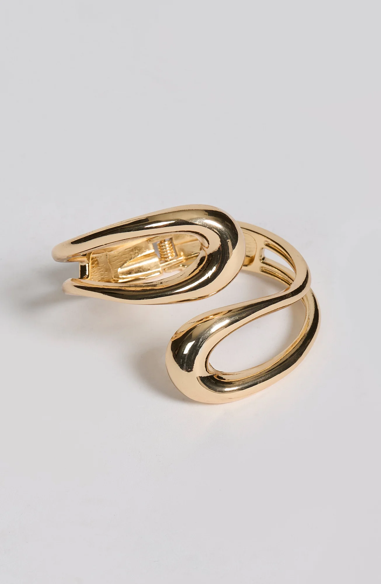 Indulge in luxury with the exquisite Nevesta Cuff Bracelet in radiant gold. This accessory boasts a high-shine polished finish and a stunning abstract design, featuring graceful curves that beautifully encircle your wrist. The hinge mechanism adds functionality to style, creating a bold and sculptural look that exudes sophistication. Elevate any outfit with this statement piece that wraps elegantly around your arm.