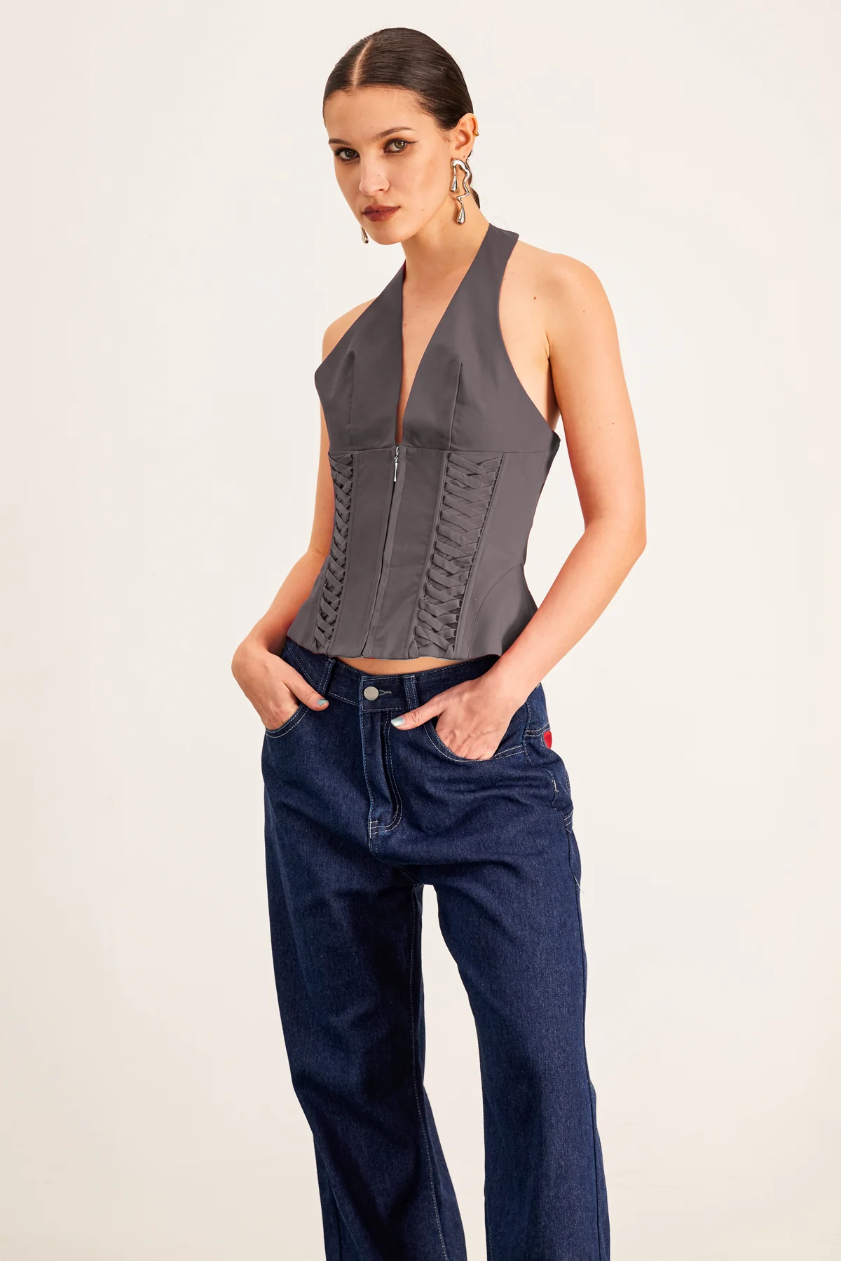 Elevate your wardrobe with the exquisite Barclay Lace-Up Halter Neck Corset Top in Grey . This stunning top features a sophisticated lace-up design and halter neckline, exuding elegance in every detail. Crafted from a blend of 50% Polyester and 50% Cotton, this top offers both comfort and style. Whether for a casual day out or a special occasion, the Barclay top is sure to make a statement. Embrace unparalleled style and quality with Barclay. Color variations may occur due to lighting during photography. Gentle machine wash recommended.