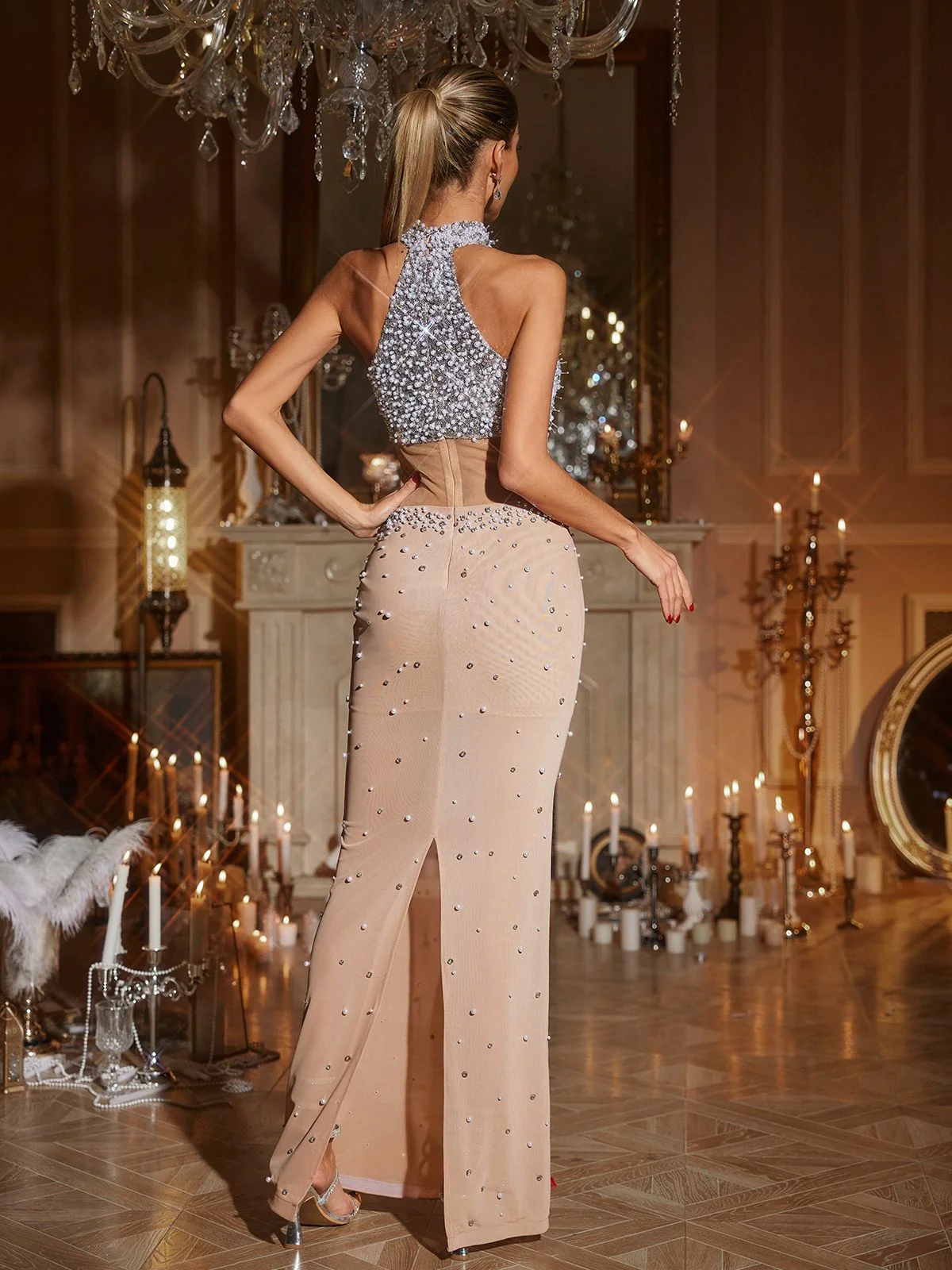 Make a captivating statement with our Elegant Halterneck Beaded Maxi Dress. This stunning dress boasts intricate beadwork on the halterneck, flowing into a glamorous maxi silhouette thats a showstopper for any special occasion. Crafted from 100% Polyester with a subtle stretch, this dress offers both comfort and style. Features an invisible zipper closure at the back. Illuminate any event with this chic, must-have piece in your wardrobe. Please note: Color variations may occur due to lighting. Dry clean recommended. Model is showcased in size S.