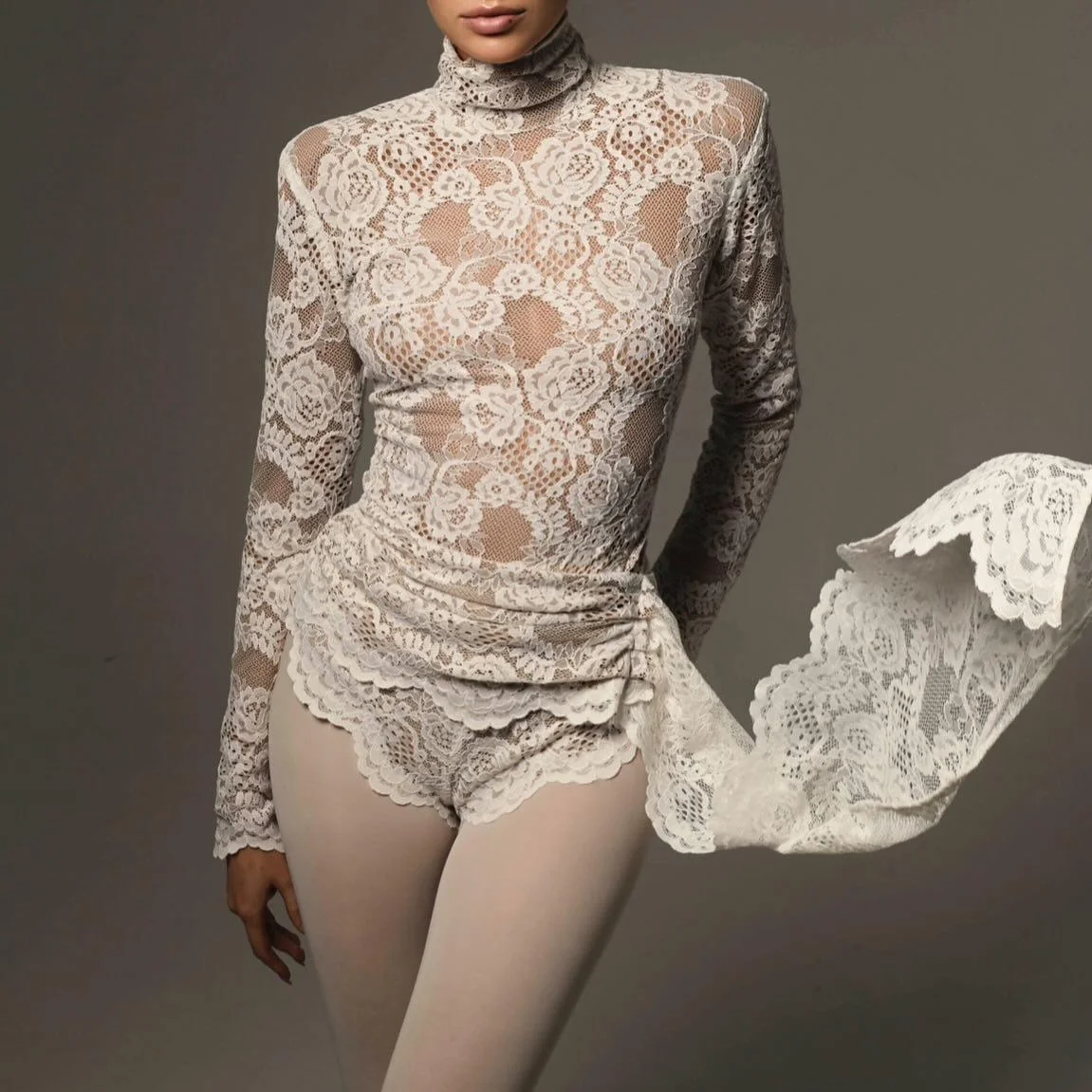 Indulge in sophistication with our elegant high neck lace jumpsuit in black and white. This fashion-forward piece combines romantic lace with a modern edge, perfect for any occasion. Crafted from intricate floral lace for sheer sophistication and versatility. Featuring long sleeves, a high neckline, and a body-hugging fit that accentuates natural curves, ensuring comfort and style. Snap closure for easy wear and semi-sheer lace design for an alluring yet modest look. Transition effortlessly from day to night with this versatile piece. Style with leather pants or skirts for evenings, and denim or mini skirts for casual days. Complete your look with statement jewelry or bold clutch bags for a refined finish. A timeless addition to your wardrobe, exuding vintage charm and contemporary flair.