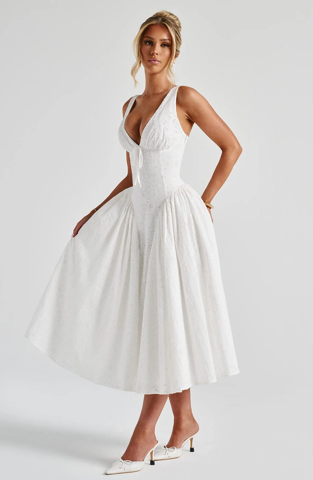 Indulge in sophistication with our ivory broderie anglaise midi dress. Perfect for garden parties and date nights, this custom cotton dress features delicate floral patterns, a charming plunge neckline, and a flattering lace-up back. Embrace playful elegance with godet panels, adjustable shoulder straps, and a full skirt for a feminine silhouette. Add a touch of romance to your wardrobe with this exquisite piece. Ideal for weddings, proms, and special occasions. Available in sizes XS to XXL.