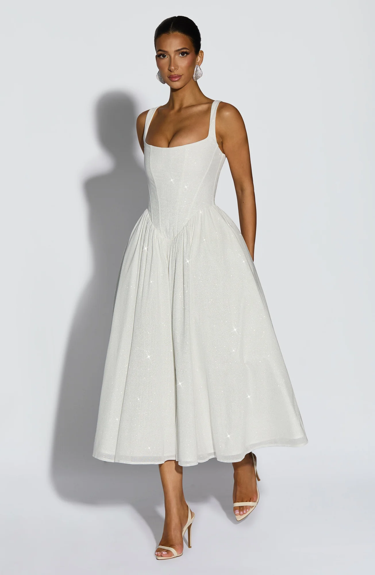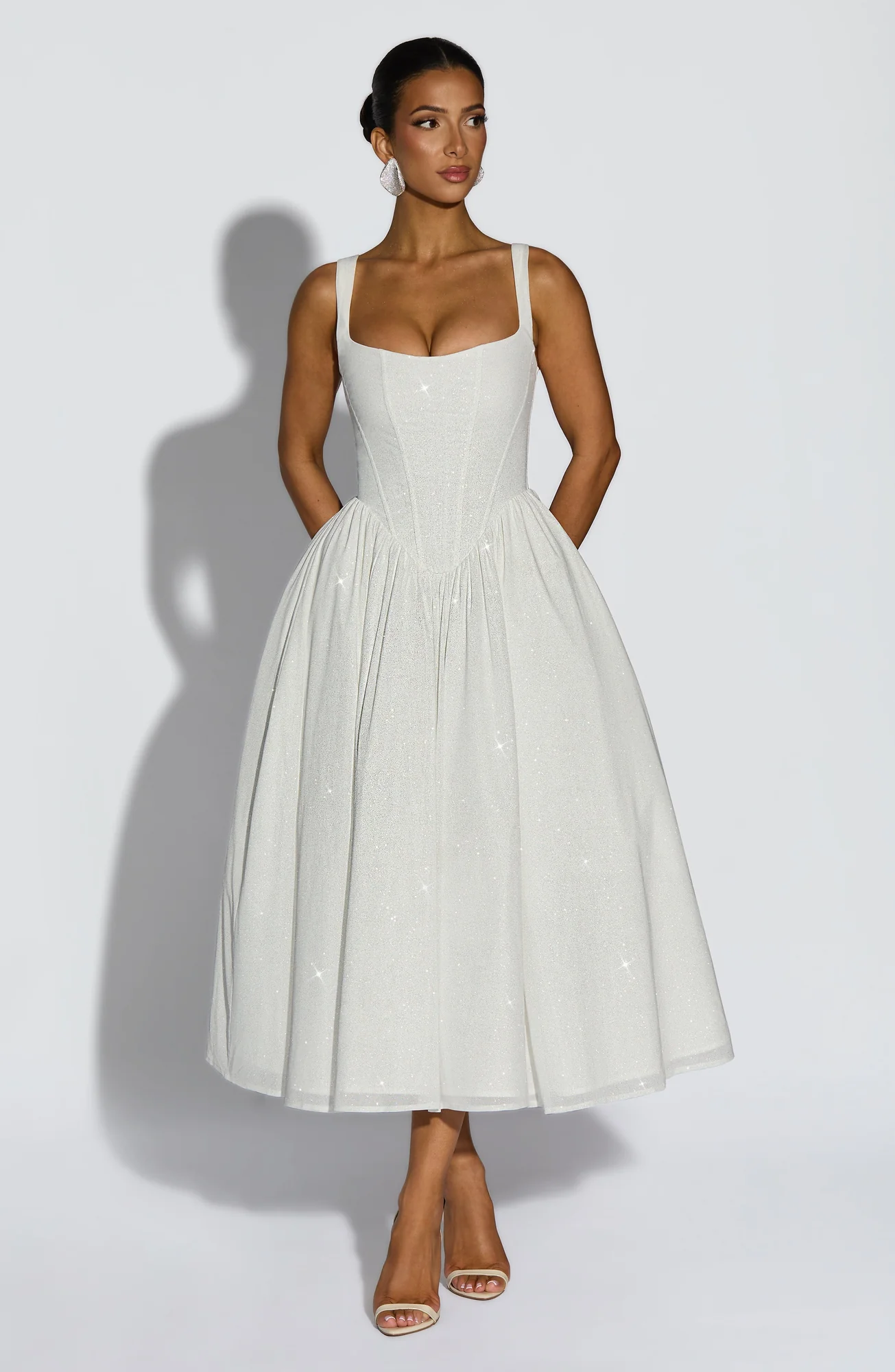 Indulge in the sophistication of the Elegant Ivory Sparkle Midi Dress from L.F. This stunning dress features a boned bodice, corset-shaped waist, and adjustable tapered shoulder straps for a perfect fit. The gathered full skirt with internal tulle offers graceful movement and volume, making it ideal for various occasions. Experience the luxurious feel of this dress, crafted with sparkle mesh fabric and fully lined for comfort. Elevate your wardrobe with this exquisite piece in Midi length.