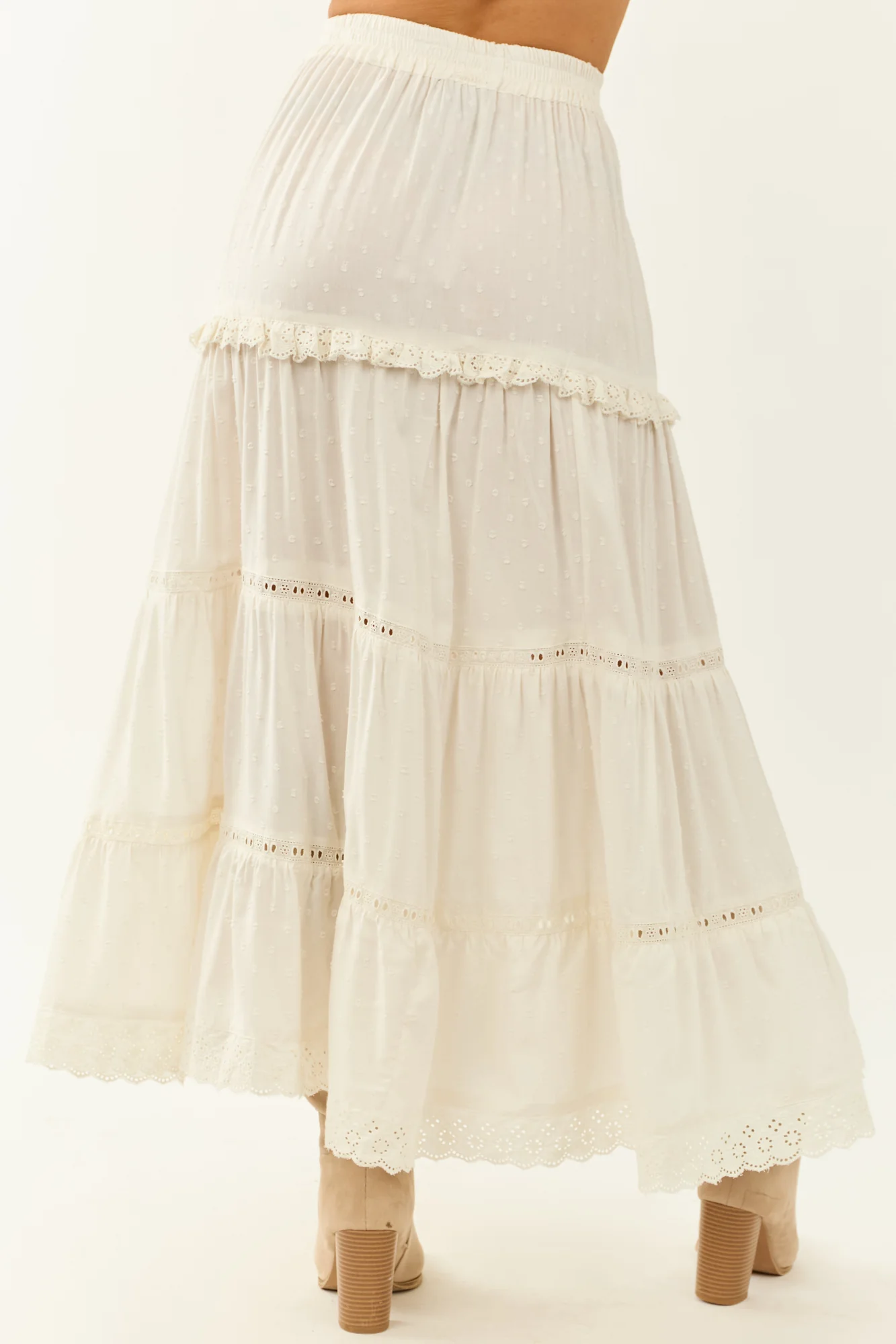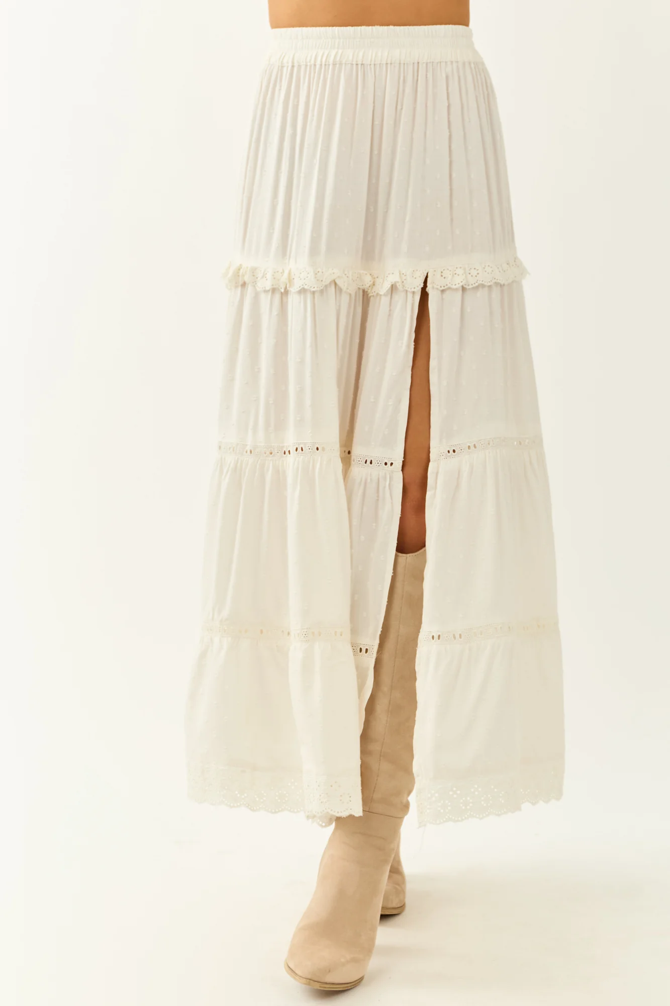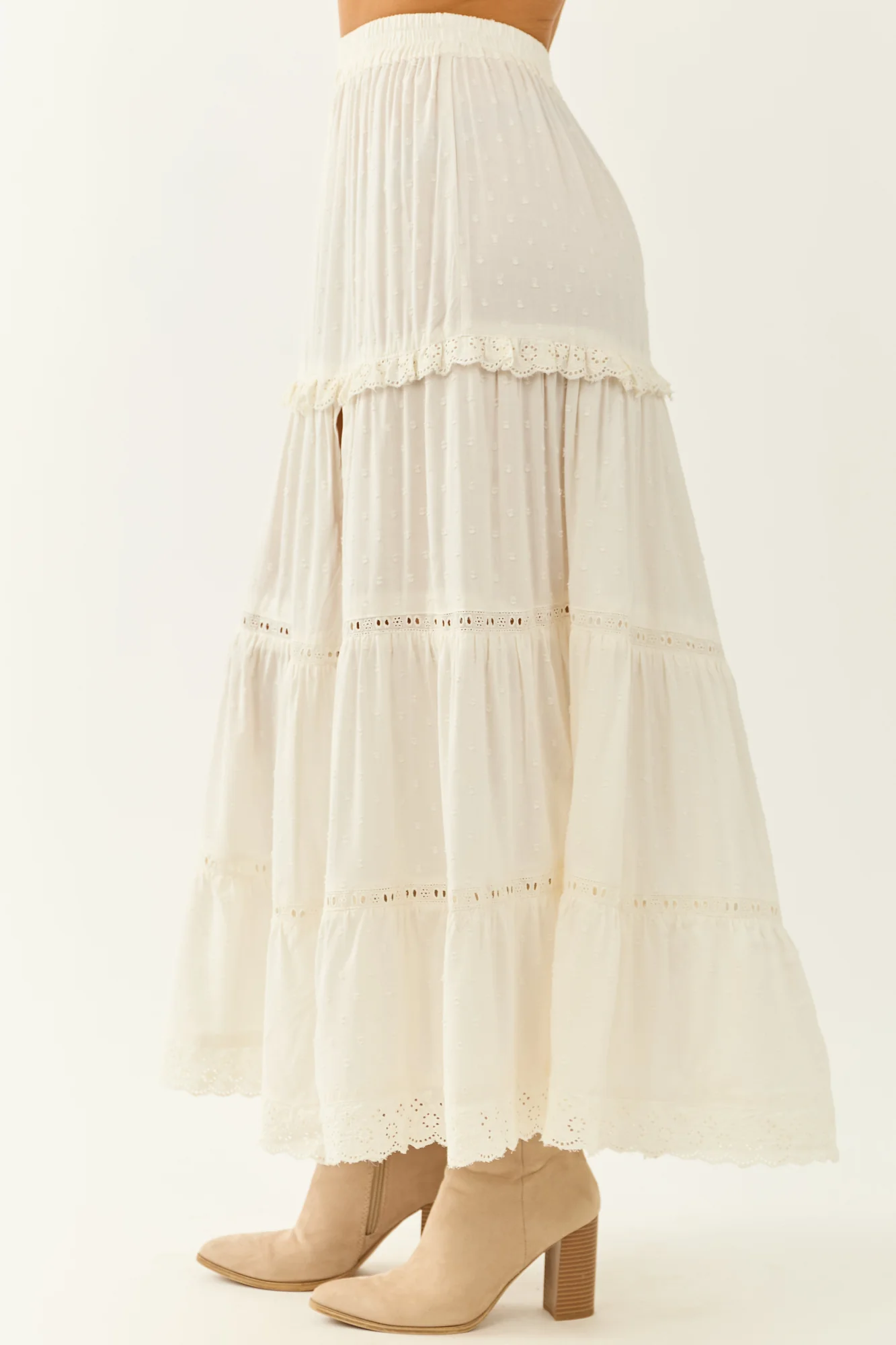 Channel effortless boho energy with this elegant ivory tiered maxi skirt . The flowy design features elastic smocked waist for a comfortable fit, tiered lace details, eyelet lace hem, and a slight sheer finish. Complete with a 26slit for a touch of allure. Versatile for spring and summer, this skirt is made of 100% Rayon and measures 37in length. Available in sizes S, M, and L. Model is wearing a size Small.