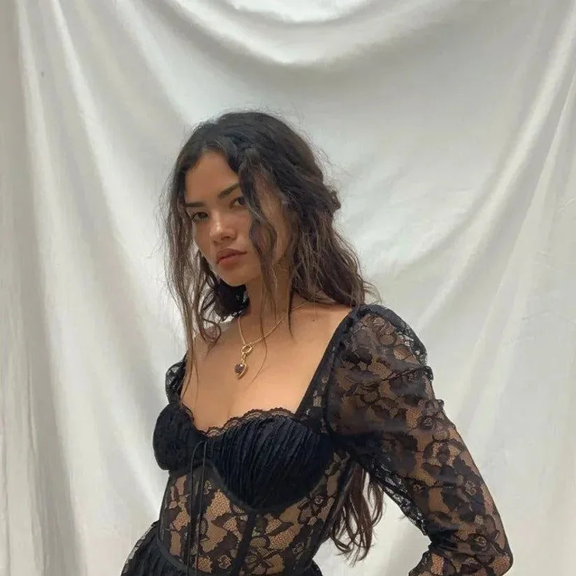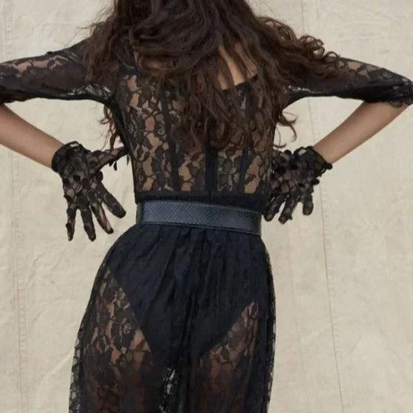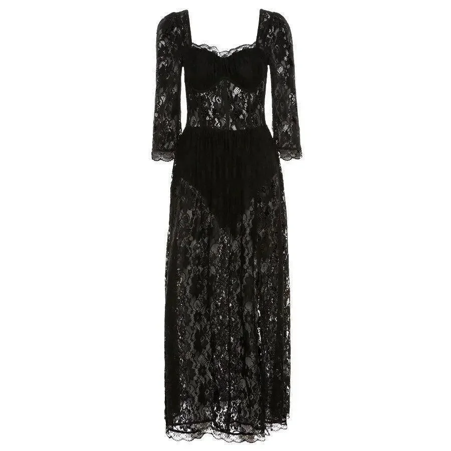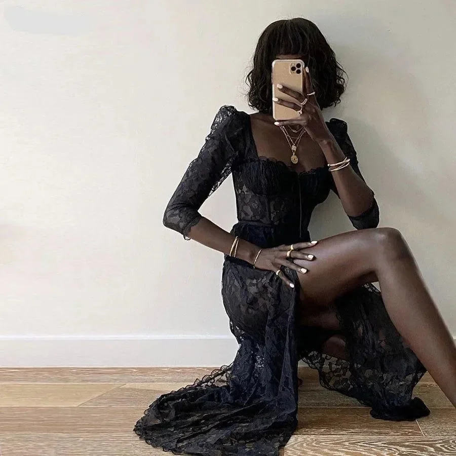 Elevate your wardrobe with our elegant black maxi dress featuring exquisite lace detailing and a stylish high slit. Perfect for special occasions, this dress combines sophistication with a modern touch. The flowing silhouette offers a flattering fit, while the intricate lace design adds a refined element, making it an ideal choice for glamorous events. Pair it with your favorite heels for a polished look. For more style inspiration and outfit ideas, visit our Instagram @mermaid_way. MATERIAL: Satin, Polyester, Spandex. Discover the perfect blend of style and grace with our black lace maxi dress. Make a statement wherever you go.