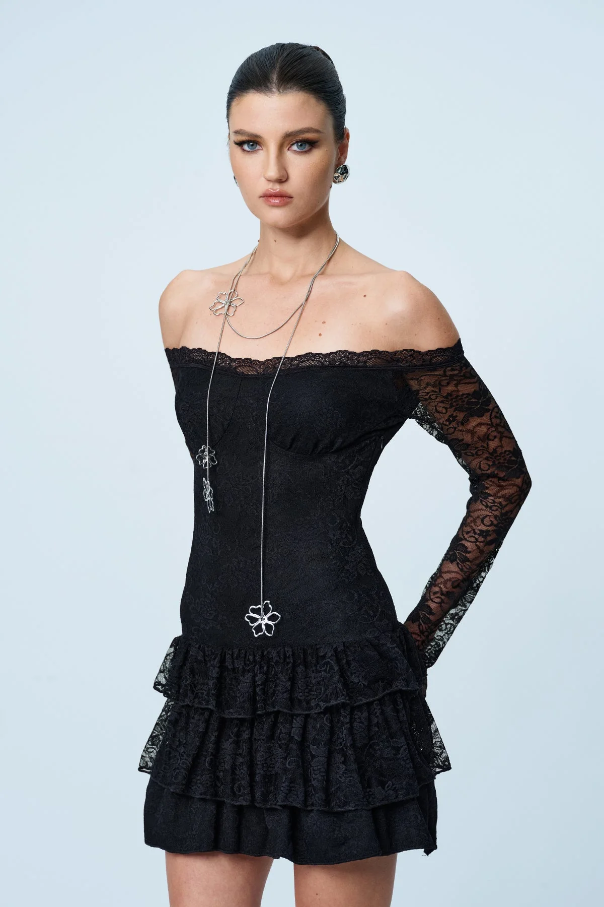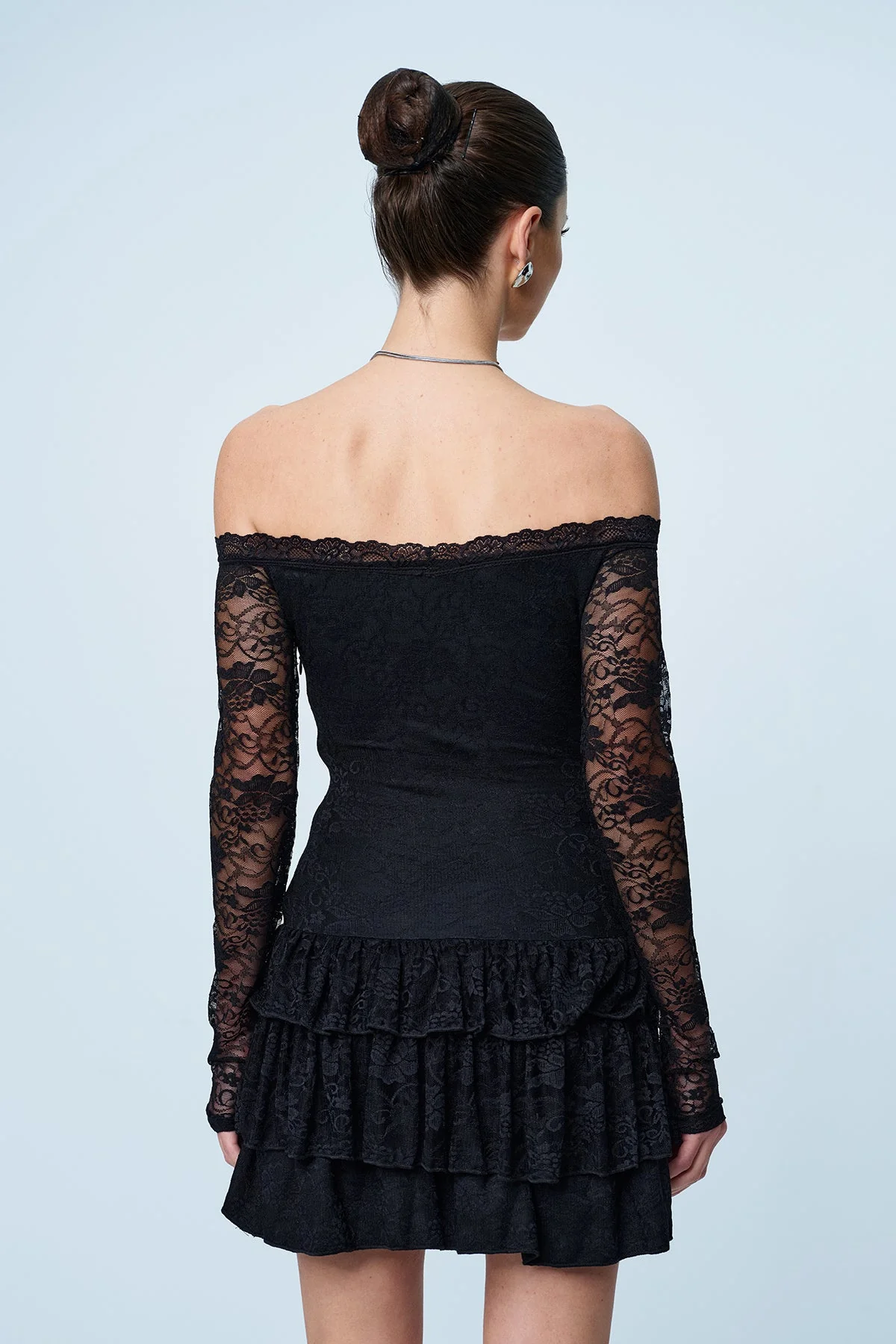 Indulge in sophistication and romance with our elegant Lace Off Shoulder Ruffle Mini Dress. Expertly crafted with delicate lace, featuring a stylish off-shoulder design and feminine ruffle details for a touch of luxury. Perfect for special occasions, this dress offers both style and comfort with a slight stretch. Enjoy gentle machine wash care for easy maintenance. Color variations may occur due to lighting. Embrace sophistication and style with this exquisite piece.