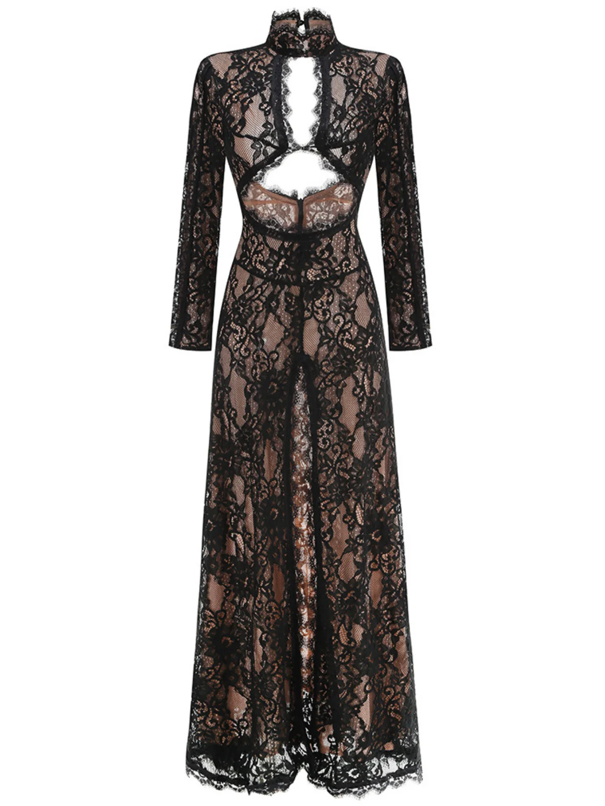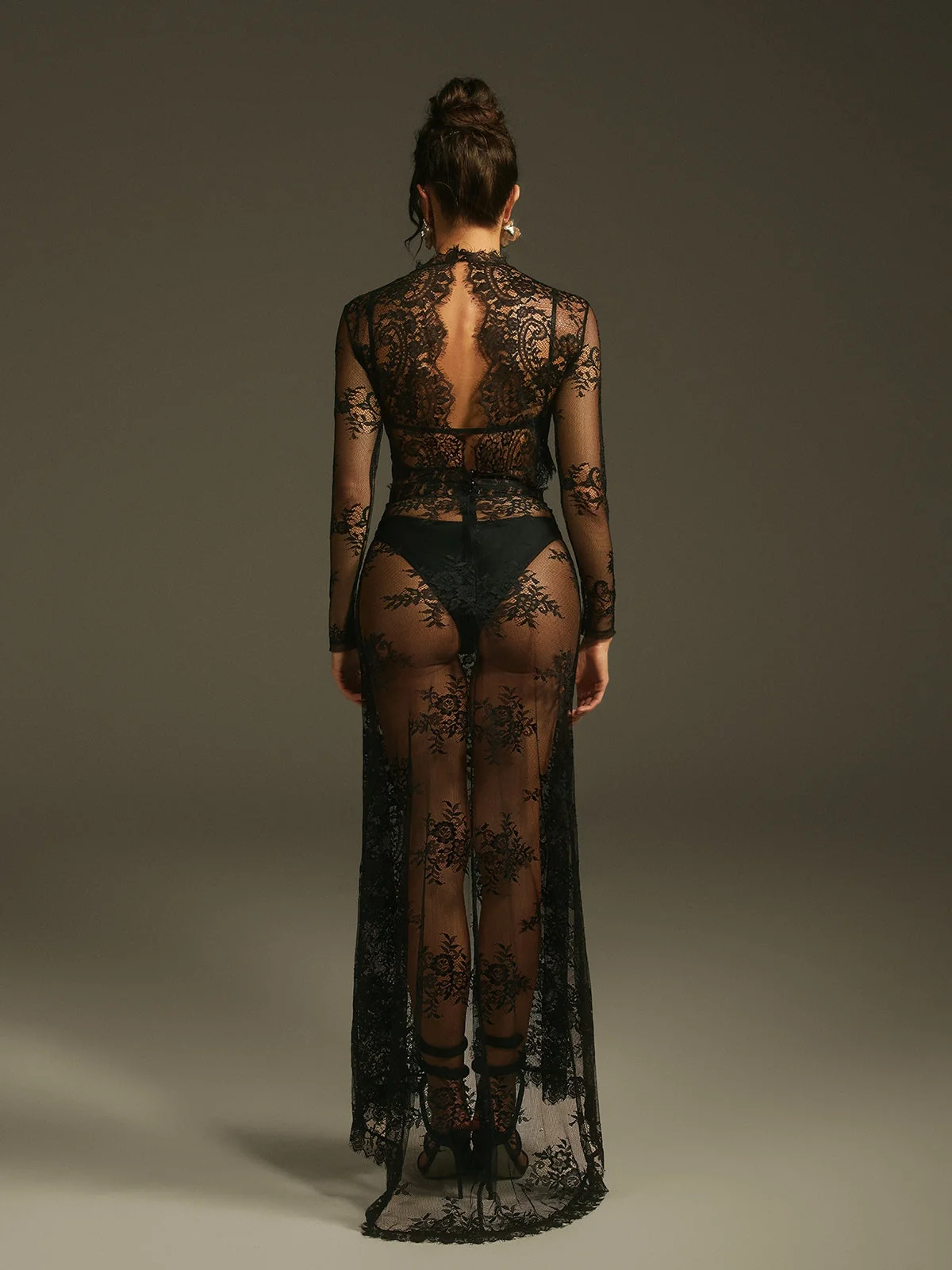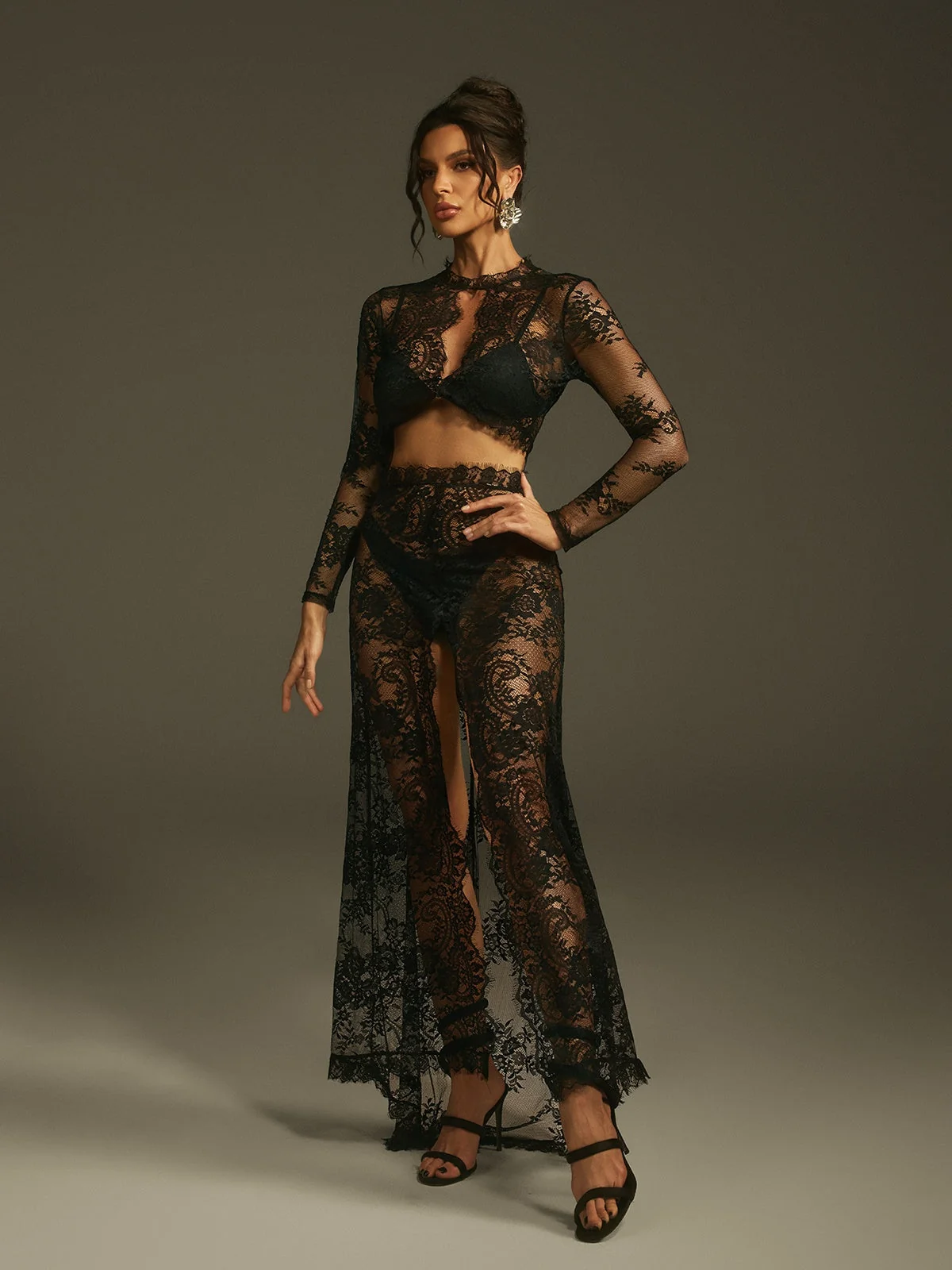 Indulge in sophistication with our Elegant Lace Split Maxi Dress with Long Sleeves. This exquisite dress, crafted from delicate lace, boasts a stylish split to captivate attention and allow graceful movement. The long sleeves exude elegance, making it ideal for special occasions or evening affairs. Embrace timeless style and exude confidence in this head-turning dress guaranteed to create unforgettable moments. Made of 100% Polyester with a low stretch factor, featuring a zippered back opening for ease of wear. Dry clean only. Please note that color may vary slightly due to lighting. Model is showcased wearing size S.