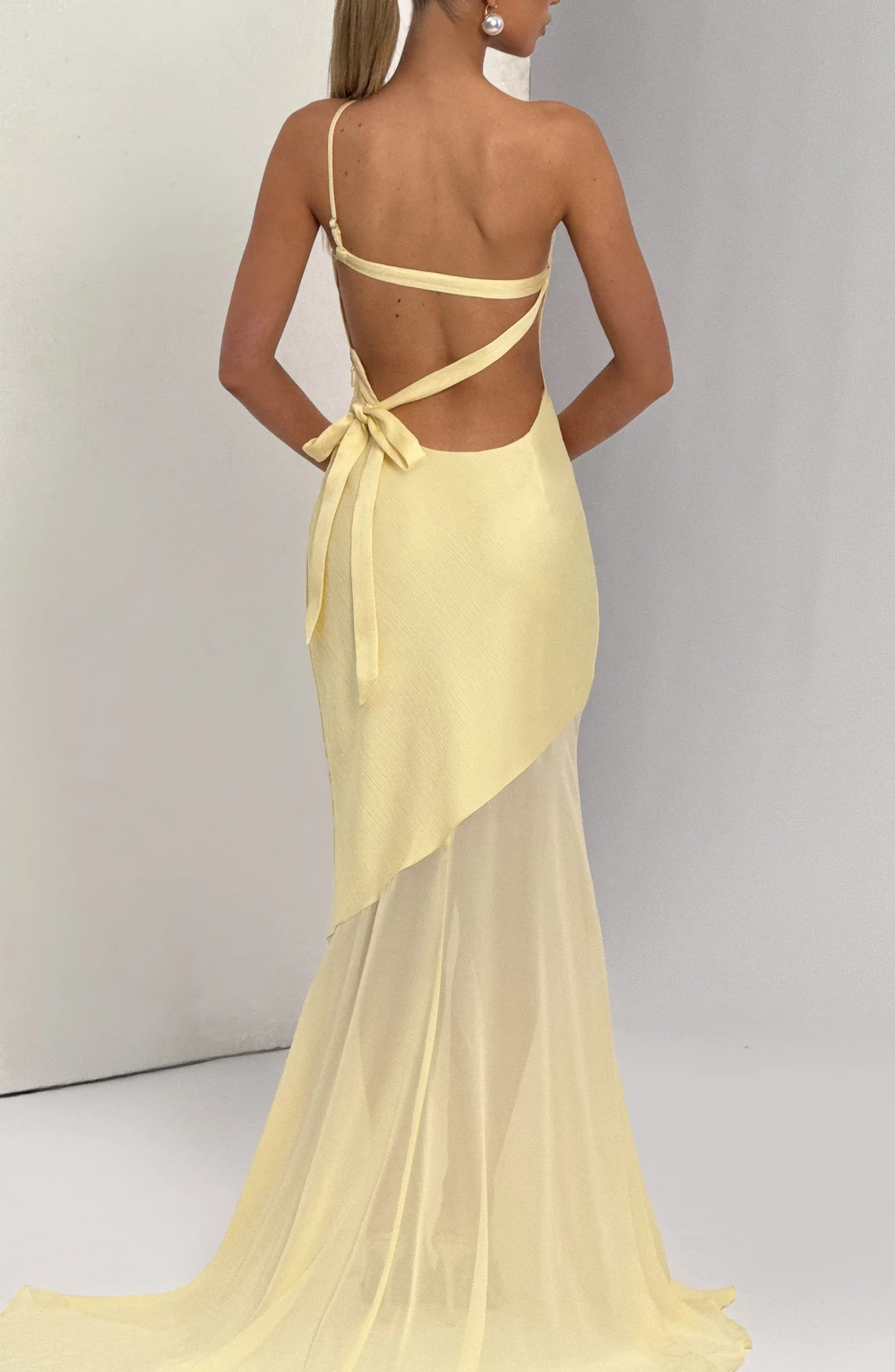 Step into timeless elegance with our Lemon Asymmetric Neckline Maxi Dress. Crafted from non-stretch textured satin, this dress features an alluring open back design, adjustable straps, and a dramatic fishtail flare with train detail. The contrast chiffon skirt adds a touch of sophistication to this one-shoulder masterpiece. Perfect for formal events and special occasions. Available in sizes S, M, L, XL, XXL, XS.