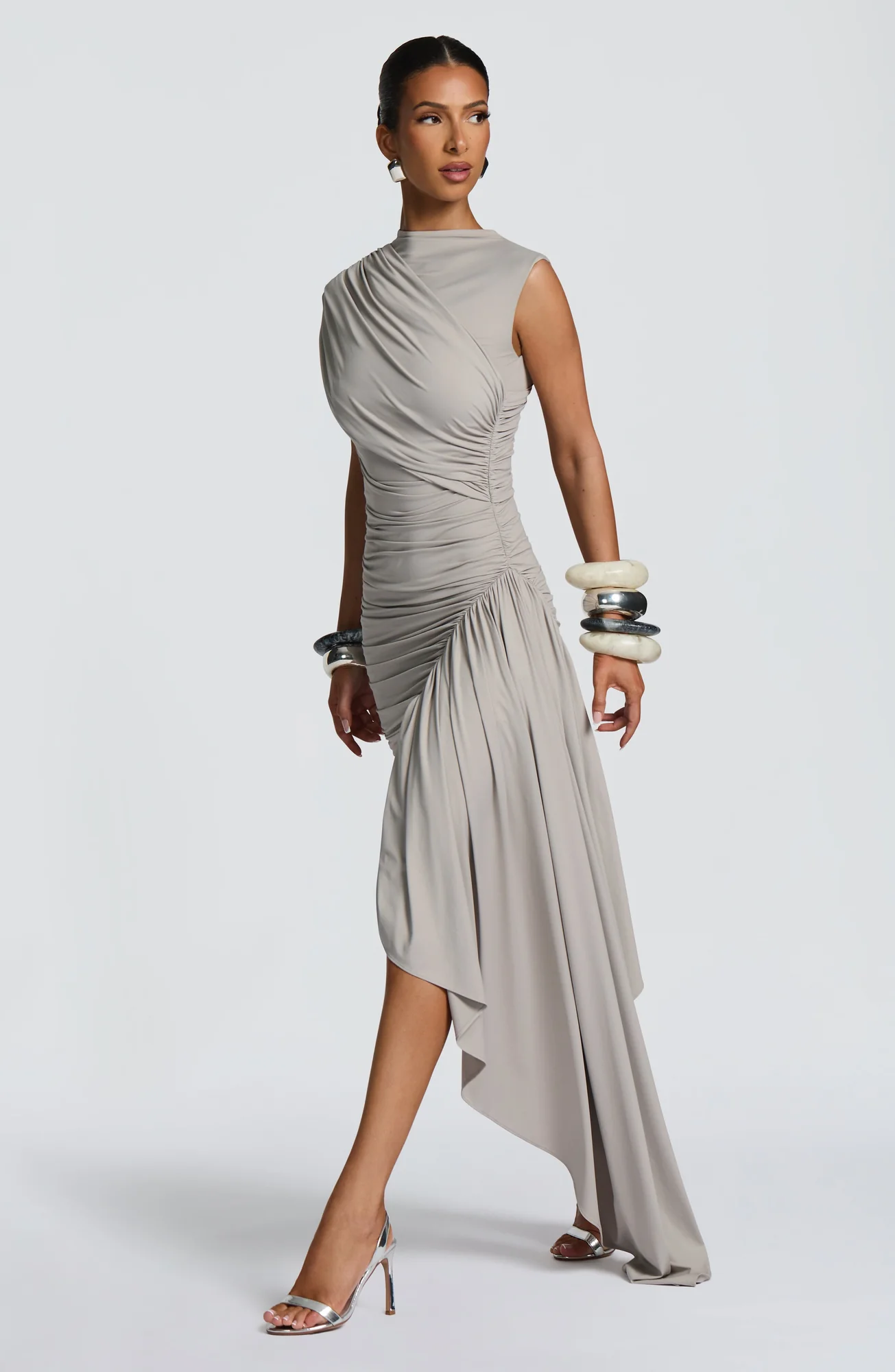 Indulge in refined elegance with our Light Grey Mini Dress. This sleek dress features multidirectional pleats, ruching, and a gathered drape panel for a sophisticated silhouette. The high neckline, keyhole detail, and cowled back add an extra touch of allure. Ideal for various occasions from parties to daytime events. Fully lined for comfort and style. Colour: Light Grey. Mini length. Slinky fit. Button and elastic loop closure. Elevate your wardrobe with this chic piece.