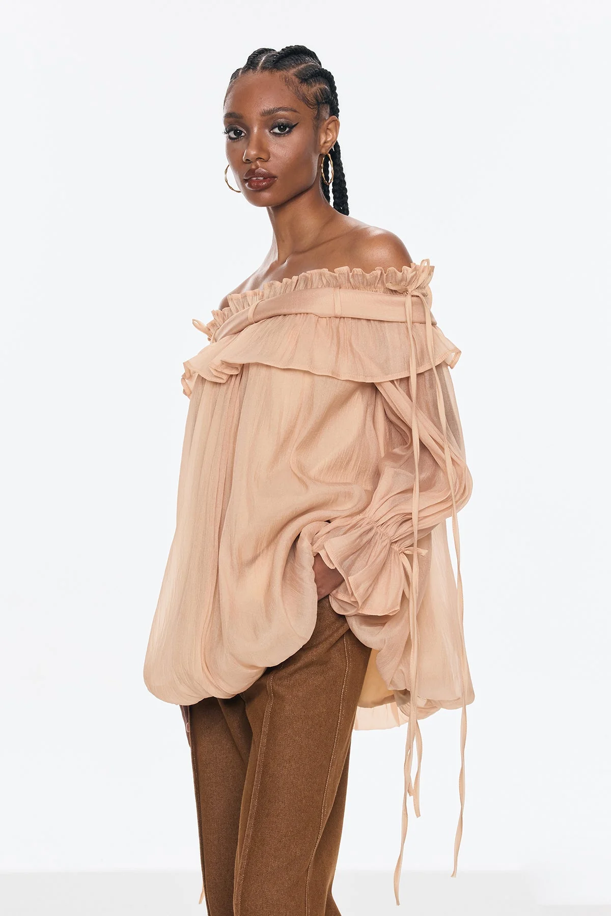 Upgrade your wardrobe with our Aneirin Off-Shoulder Mesh Ruffle Top in Khaki. This trendy and elegant top features an off-shoulder design for playfulness and mesh ruffle detail for sophistication. Made with high-quality 50% Polyester and 50% Cotton blend, this top offers comfort and style. Perfect for the romantic coquette in you. Available sizes: S, M, L. Material: 50% Polyester, 50% Cotton. This romantic piece can be gently machine washed for easy care. Please note, color may vary due to lighting in images.