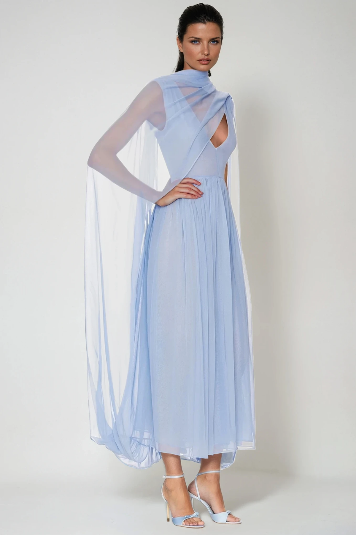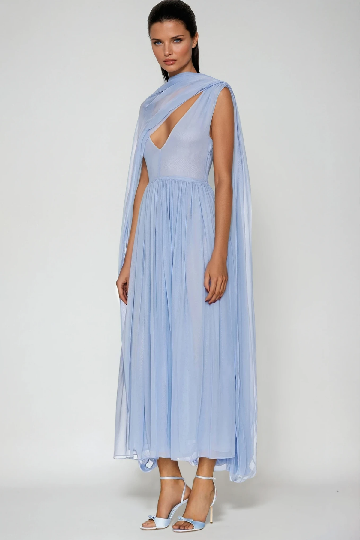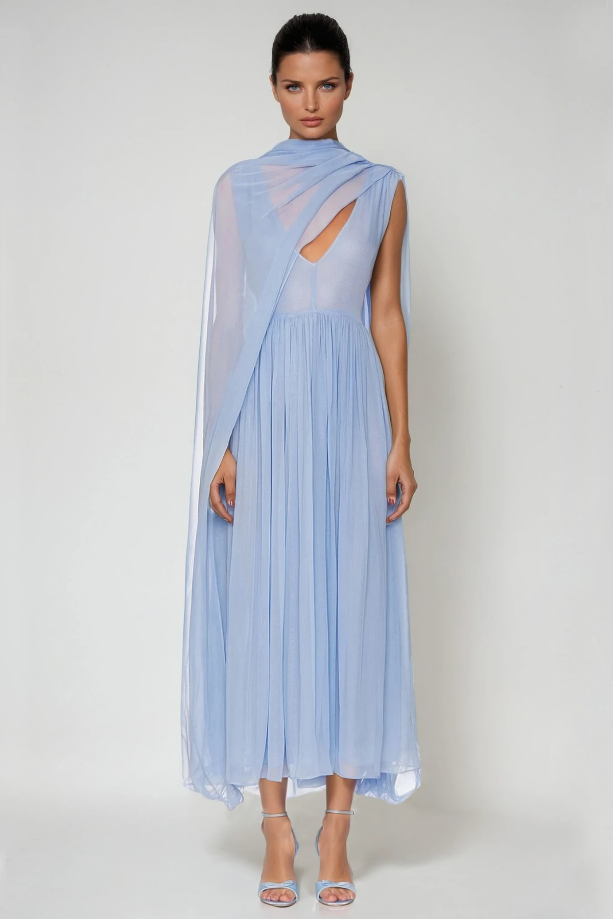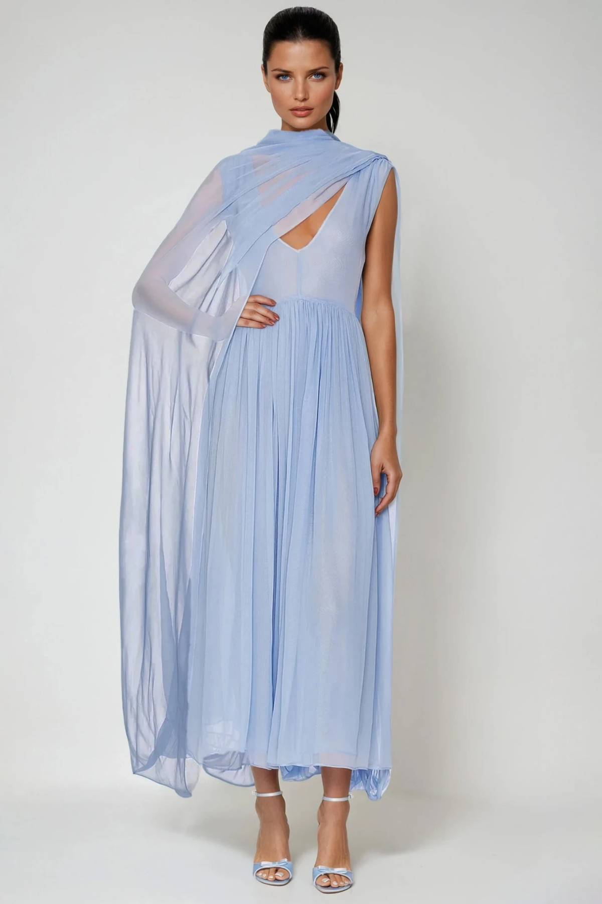 Elevate your style with the Elegant Mesh Shawl Maxi Dress. This dress features a deep plunging neckline and sheer shawl, exuding sophistication. Designed for comfort and allure, its perfect for formal events that demand grace and confidence. The slight stretch adds to the flattering silhouette. Embrace elegance and charm effortlessly. Color variations may occur due to lighting conditions. Experience true refinement with this captivating piece .