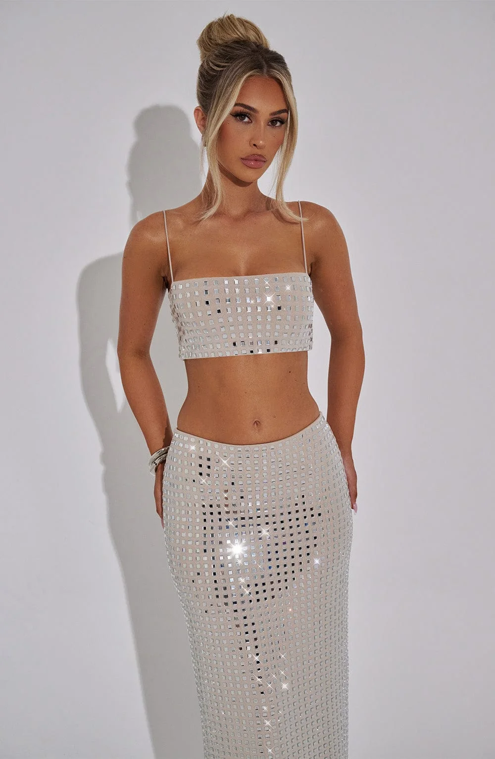 Indulge in the luxurious charm of our Elegant Nude Dimity Crop Top crafted from premium stretch mesh for a comfortable fit and adorned with exquisite hotfix rhinestones, making it a true statement piece. This stunning top features elasticated spaghetti straps, a fully lined design, and a cropped length that exudes elegance and sophistication. Perfect for any occasion, pair it with the Dimity skirt for a mesmerizing ensemble that will make you shine all night long. Embrace the allure of nude beauty today! The Elegant Nude Dimity Crop Top is a must-have addition to your wardrobe for a touch of glamour and style.