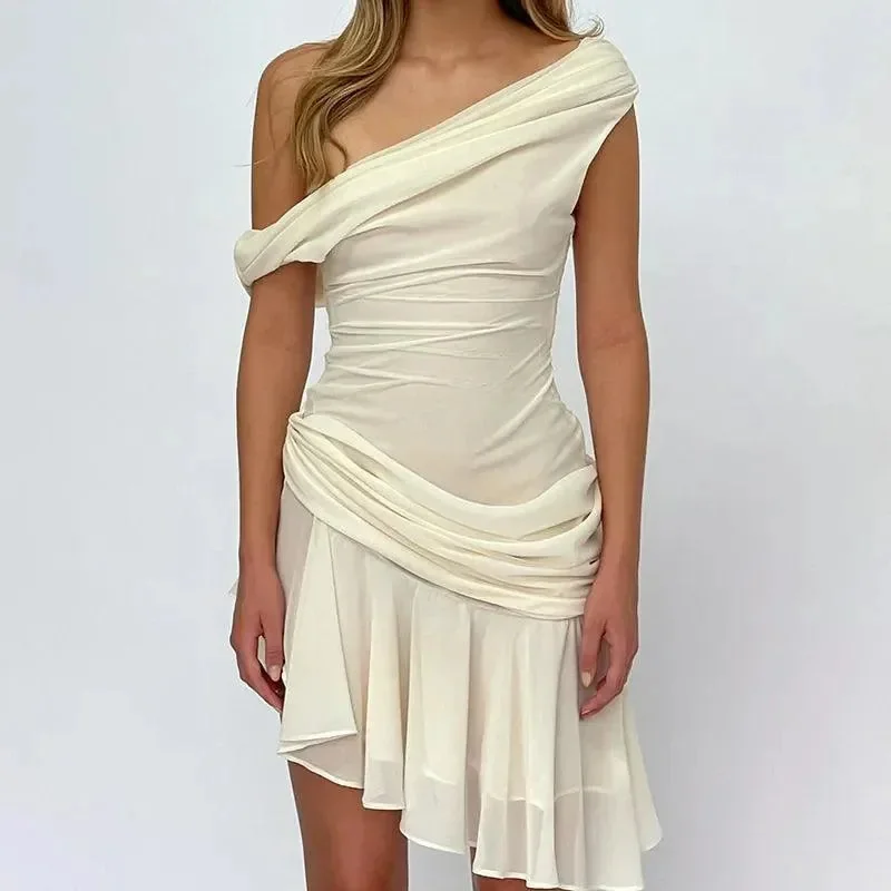Elevate your elegance with our off-shoulder draped mini dress in burgundy and ivory. Perfect for evening events and special occasions, this knee-length dress features a sophisticated silhouette, side zip, asymmetrical side slit, and luxurious draping. Crafted from high-quality fabric for comfort and style, the dress enhances your figure with a flattering fit. Transition effortlessly from day to night with this chic and versatile piece. Shop now for timeless elegance! Free size exchange available.