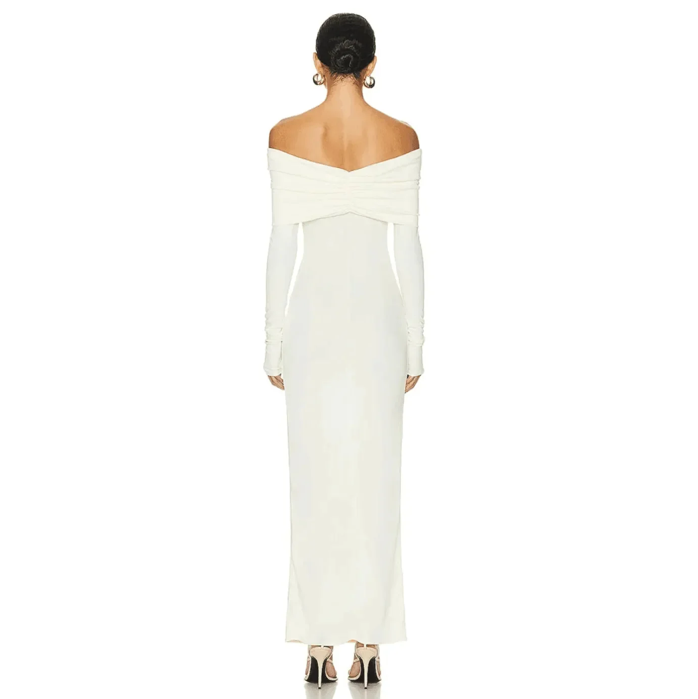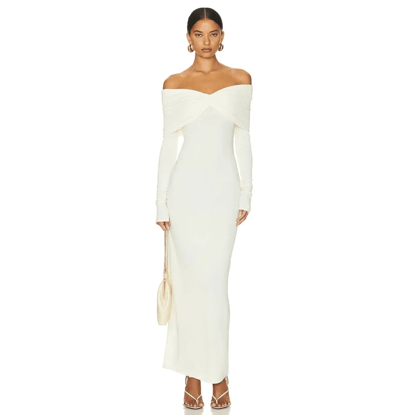 Elevate your style with our premium stretch jersey Off-Shoulder Maxi Dress. This stunning dress features a flattering bodycon fit, bardot neckline, and long sleeves, enhancing your silhouette for elegant occasions. Made from luxurious fabric, it drapes beautifully for a graceful look that seamlessly transitions from day to night. Shop now for the perfect blend of style and comfort!