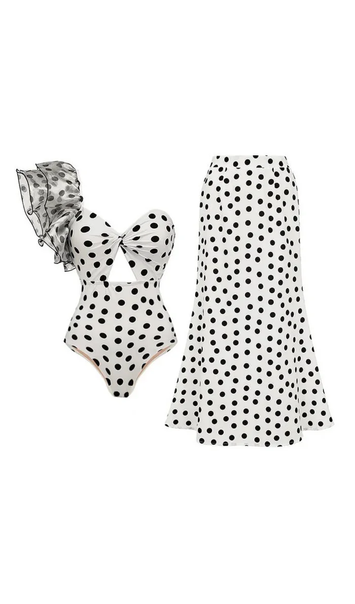 Indulge in elegance with the Keira one-shoulder swimwear set featuring ruffles and polka dot pattern. Crafted from high-quality fabric, this set offers comfort and durability, perfect for making a statement at the beach or pool. Embrace your unique style with this chic attire that fits true to size. Color may vary in images due to lighting. Please refer to our size chart for the best fit.