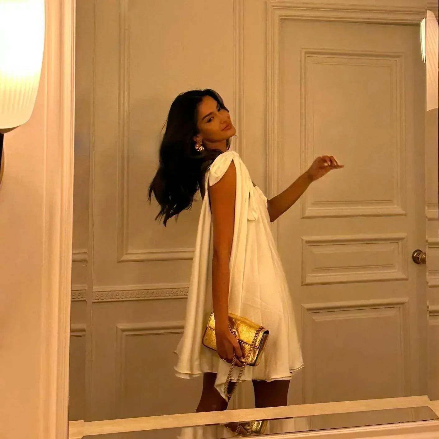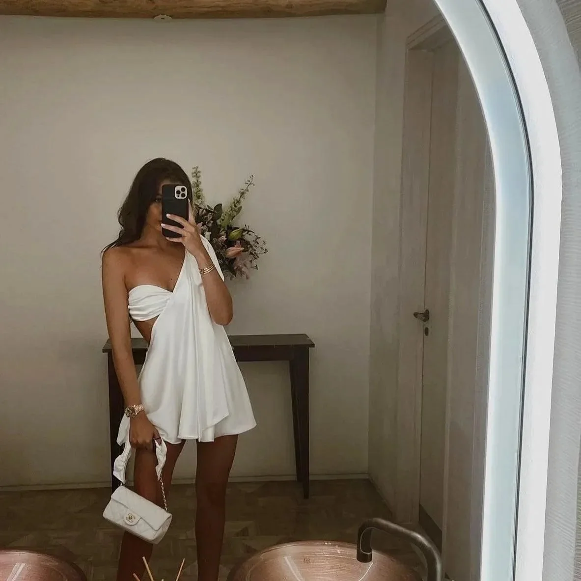 Indulge in elegance with our stunning One Shoulder Mini Dress in white. Featuring a chic one-shoulder design and a playful swing silhouette, this dress is perfect for special events. The asymmetrical neckline adds a daring touch while the high-quality fabric ensures both comfort and style throughout the day. Dance with grace in the flowing skirt, ideal for evening outings. Be the center of attention at cocktail parties, dinner dates, and special occasions. Experience the charm now!